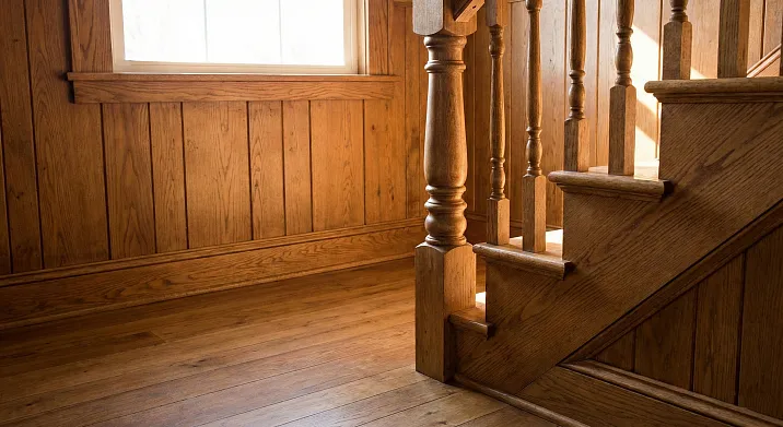 Есть один простой тест, который выдаёт непрофессиональный ремонт мгновенно. Не осмотр стен, не проверка потолков — достаточно взглянуть вниз и вверх одновременно: на плинтус у пола и на балясины лестницы. Если эти два элемента живут в разных мирах — разные породы, разный тон, разный профиль — весь интерьер рассыпается. Не потому что каждый из них плохой, а потому что они не разговаривают друг с другом.