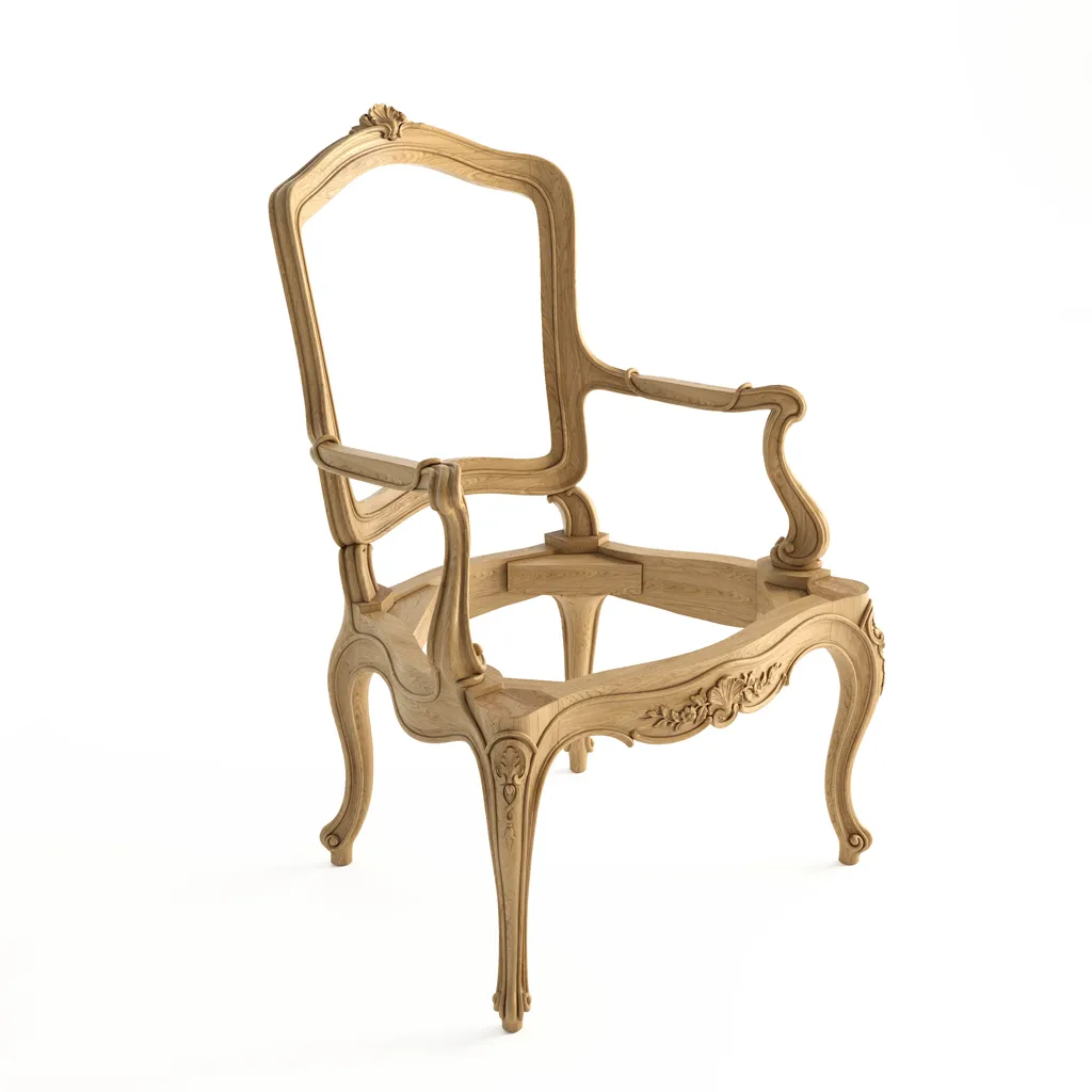 Carved frame of a cabriolet chair in the Louis XV style. This elegant chair stylistically corresponds to the middle period of the French king’s reign, which was also called the French Baroque period.