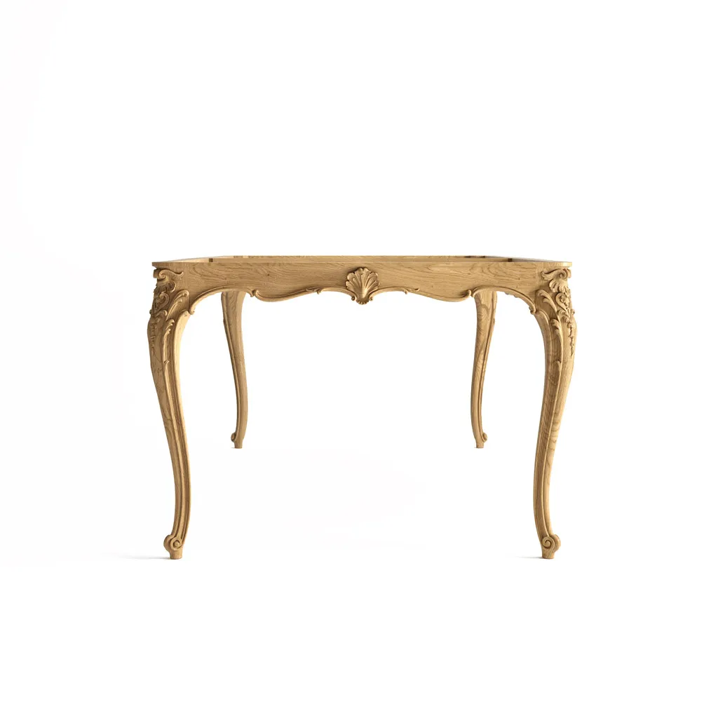 The table is functional, designed for long-term use, and can be made from solid beech or oak. Curved cabriole S-shaped legs form a unified decorative composition with ornate carved motifs. The table's decoration consists of combinations of acanthus leaves, geometric straps, stylized rocaille, and flower buds. The table's construction is designed for heavy loads, and even heavy stone slabs can be used as tabletops.