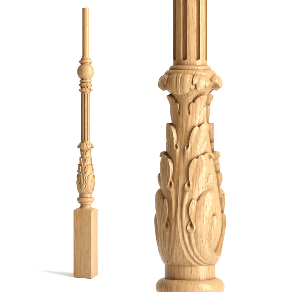 Model L-002 is an elegant wooden baluster designed in the Renaissance style. This model is adorned with three-dimensional carved acanthus leaves, and the top part is enhanced with vertical grooves, giving your staircase lightness and elegance. These wooden balusters will beautifully complement the carved posts L-069, designed in a similar style.