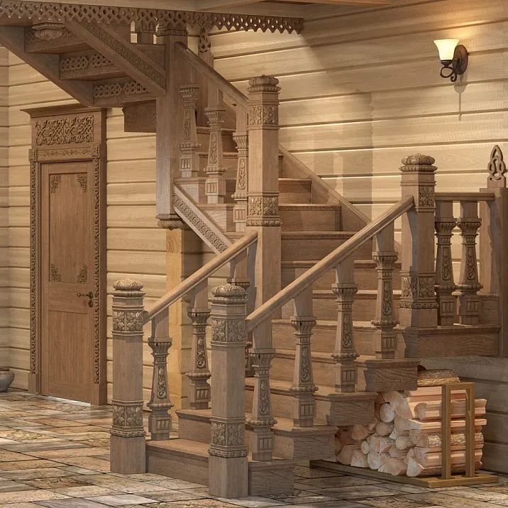 ● The wooden stair baluster L-009.1 has a unique design in Russian style. The baluster has a wide and rectangular shape, giving the staircase a sturdy and solid appearance. The baluster is also decorated with carved patterns in the form of grass and flowers, evoking the beauty of Russian nature and culture. The baluster is painted in the natural color of wood, highlighting its texture and carving.