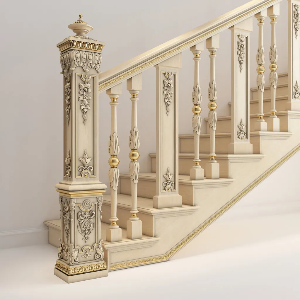 ● It has an original and elegant design that highlights the wood carving. It creates a sense of volume and depth, giving the staircase sophistication and luxury.