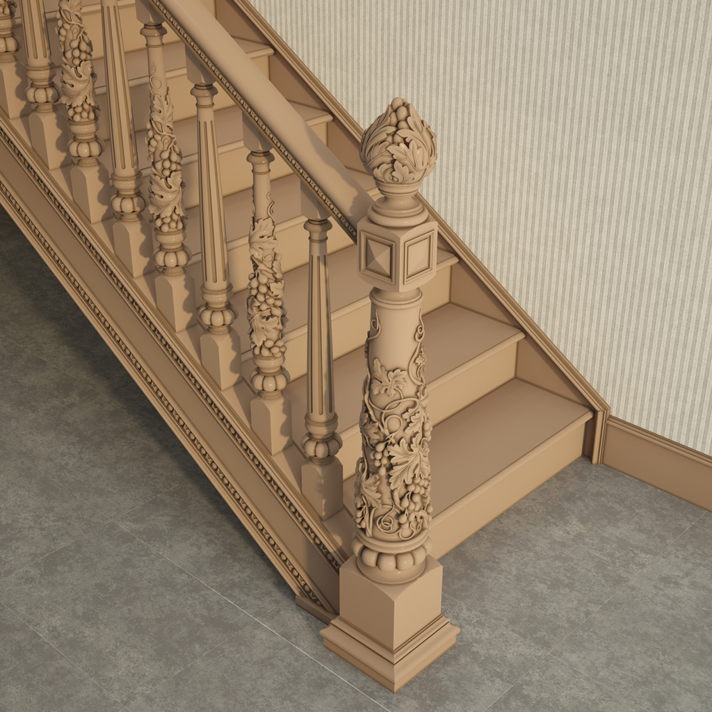 The wooden stair post L-061.02 has a cylindrical shape that widens at the top and bottom. A decorative carved head is located at the top of the post, serving to mount handrails. At the bottom of the post, there is a special platform that ensures stability and reliability of the post. The most impressive feature of this post is its carved pattern, which covers the entire surface of the post. This pattern is executed in the Baroque style, characterized by abundance of details, elegance of lines, and smoothness of forms. The pattern represents a complex interweaving of leaves, flowers, scrolls, and volutes. It creates a sense of luxury and refinement, as well as gives the post volume and relief.