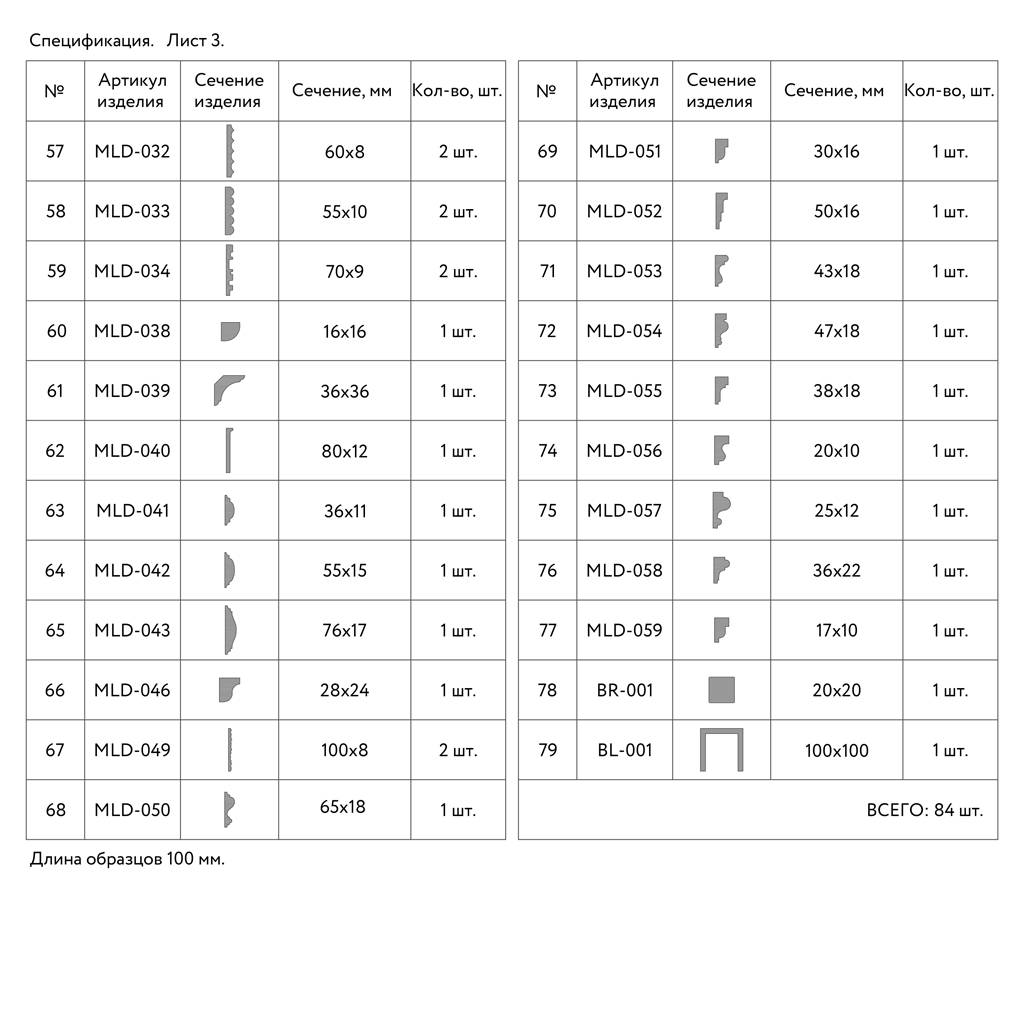 Standard sample length is 150-200 mm, providing sufficient size for profile evaluation while maintaining set compactness. Sample width varies from 8 to 120 mm depending on profile type, matching real molding dimensions. Sample thickness ranges from 3 to 50 mm, demonstrating the entire spectrum from thin moldings to heavy cornices.