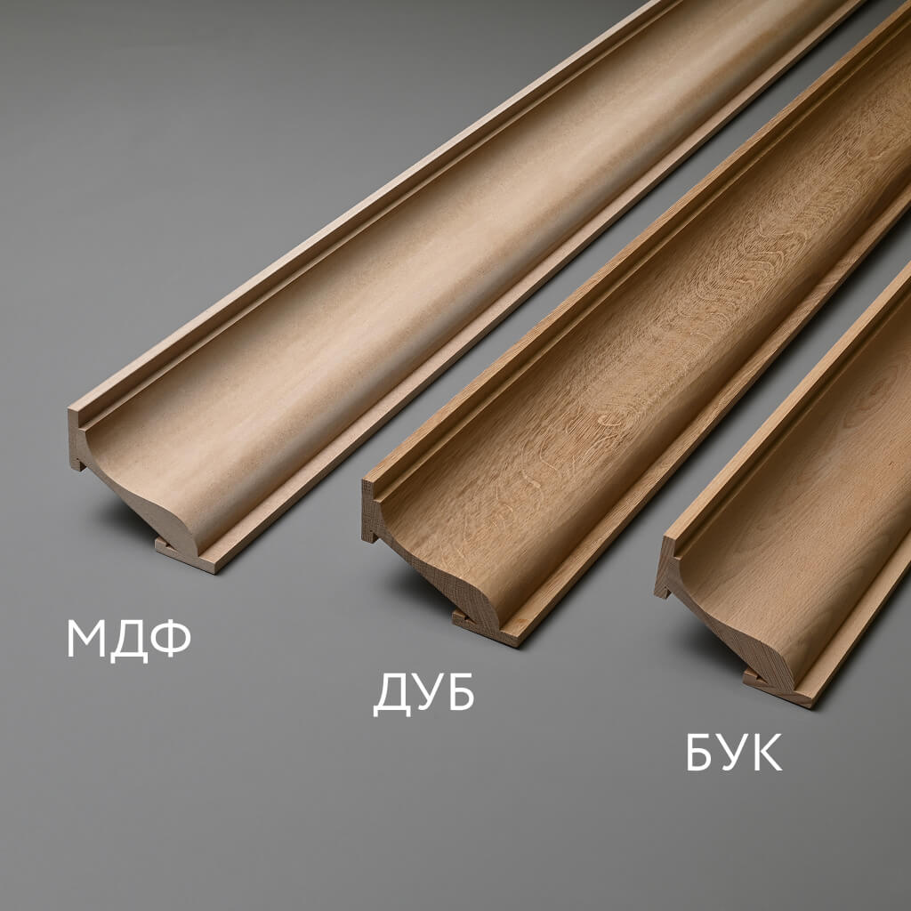 Durability of materials guarantees long service life of the molding without loss of functional or aesthetic properties. Solid oak and beech last 25-30 years, MDF — 15-20 years. Strength of glued laminated beam joints exceeds strength of solid wood, ensuring structural reliability. Resistance to temperature and humidity fluctuations prevents deformation and cracking.