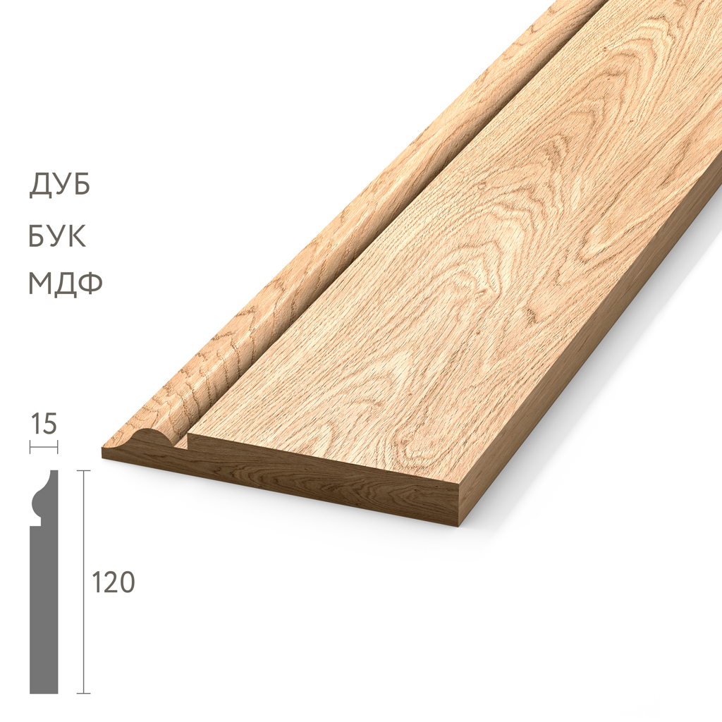 Wide skirting board 120×16/15 forms the basis for classic finishing and traditional-class construction, where reliable elegant proportions combine with the durability of natural wood. A wooden skirting board with a wide classic cross-section brings traditional reliability and elegant quality to classic construction compositions and traditional interior solutions.