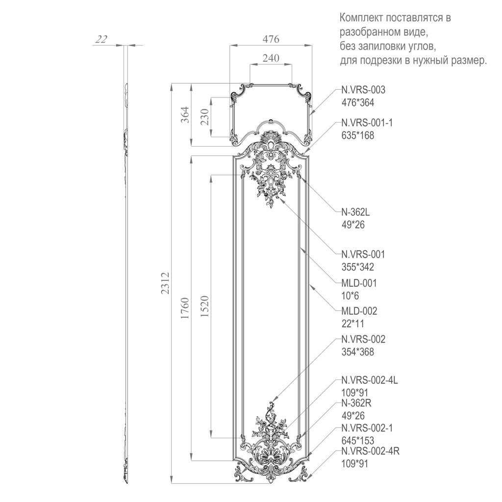 The C.VRS-056 decor set is a refined and functional solution for decorating furniture, walls, and doors. This set of decorative elements is designed for those who strive to create a stylish and harmonious interior with aristocratic touches. The universal design and exceptional craftsmanship make the C.VRS-056 set an indispensable choice for decorating furniture classic and modern styles.