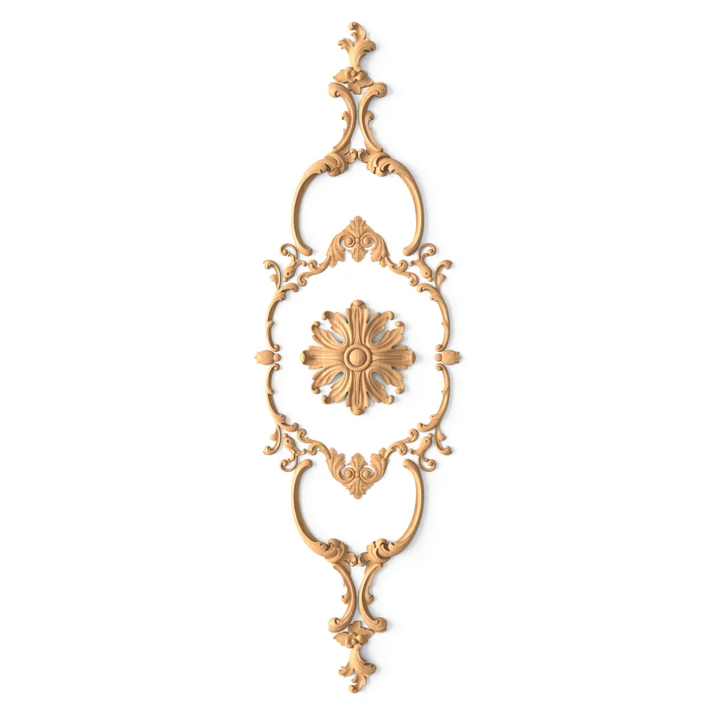 ● Carved Inlay N-433R. This element is adorned with a carved ornament of leaves and flowers, creating a three-dimensional and relief effect. The inlay is suitable for decorating the right side of the side of furniture, doors, windows, fireplaces, arches, etc.