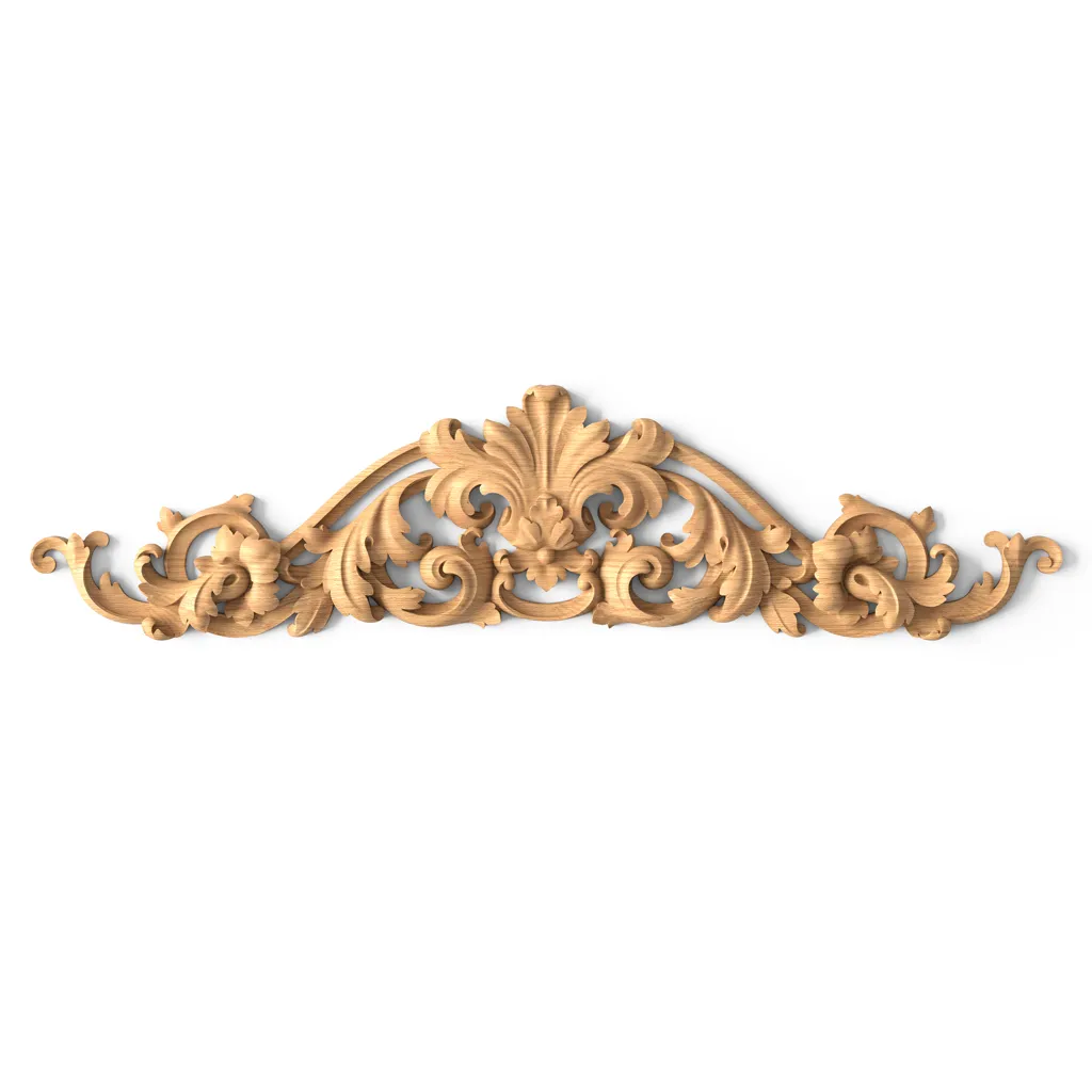 The carved wood inlay N-034 has a rectangular shape with rounded corners. Its dimensions vary, allowing you to choose the right option for any object. The surface features a floral ornament composed of elegant leaves, scrolls, and buds. The ornament is in the Baroque style, characterized by richness, opulence, and dynamism. The wood color can be natural, dark, or light, depending on your preferences and interior color scheme.