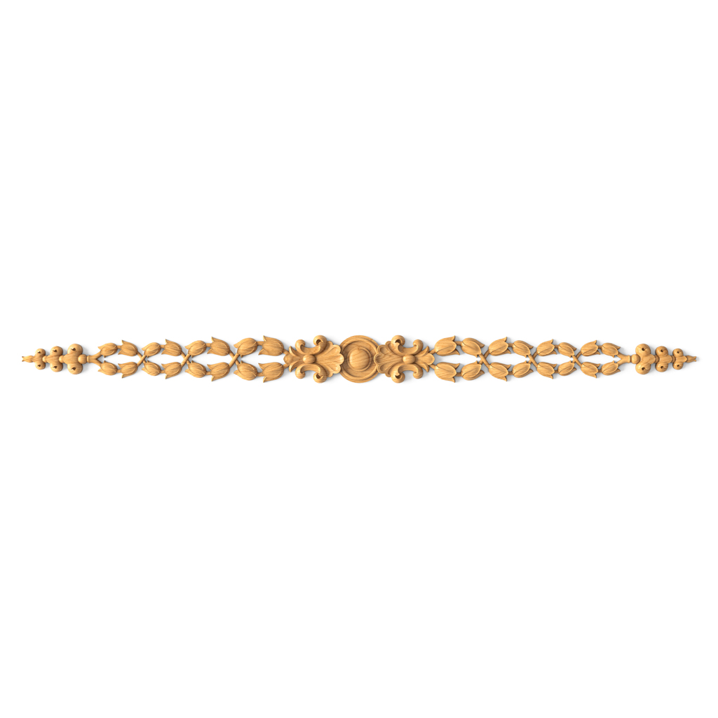 Decorative inlay N-073.1 is designed as a horizontal ornamental frieze, showcasing the skill of woodcarvers and deep understanding of decorative-applied arts principles. The central element of the composition is a round medallion framed by elegant vegetal motifs that symmetrically spread in both directions, creating a harmonious and balanced pattern.