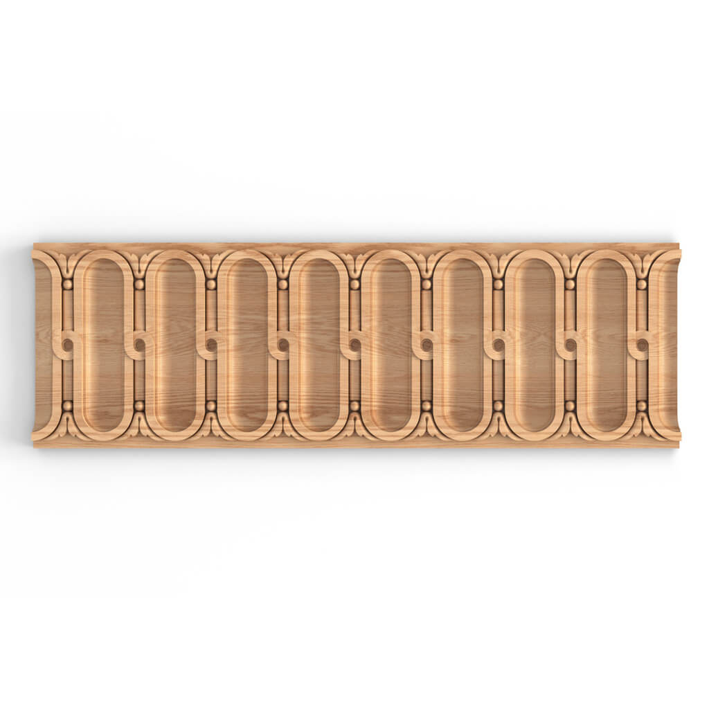 Classic Carved Molding K-046 with 'Spoon' Motifs — molding with oval recesses and delicate floral patterns. Often used in cabinet, bedside table, dining table, and wardrobe design. It can be part of a frieze or a standalone wall decoration element. The decorative wooden molding K-046 will elegantly adorn an office or library. It is also included in church-related objects. It beautifully complements floral and botanical decor, is convenient to install due to its short pattern repeat.