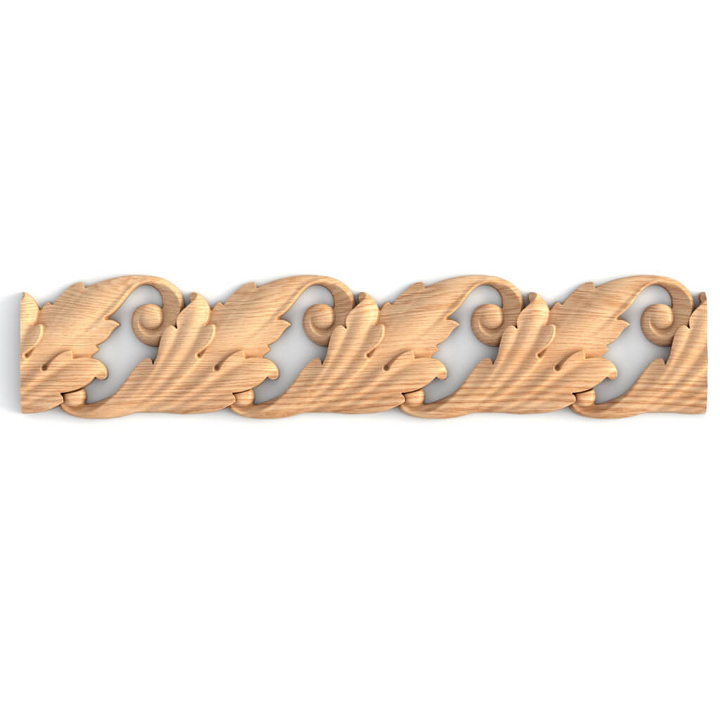 Carved Molding K-056 "Acanthus Leaf" — an exquisite decoration for kitchen and bedroom furniture, doors, as well as offices, living rooms, and staircases. The standard molding grid is developed based on the most popular requests. The convenient ornament step simplifies design and fitting. Wooden molding can be used as a standalone frieze or part of it. It adds nobility and elegance to furniture or interiors.