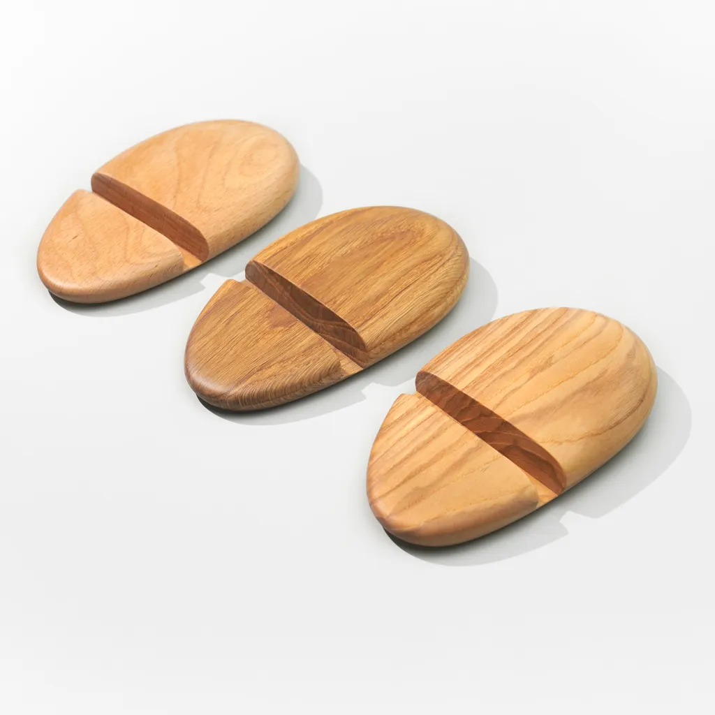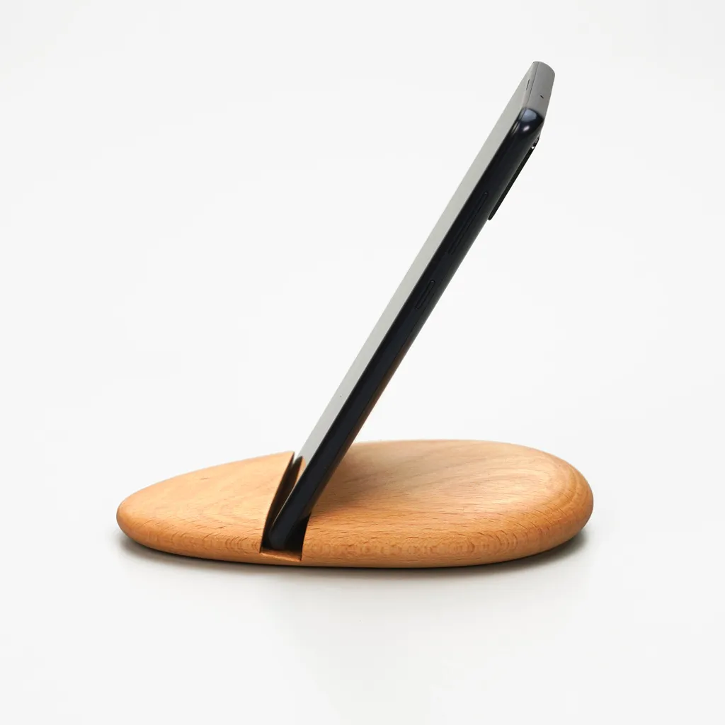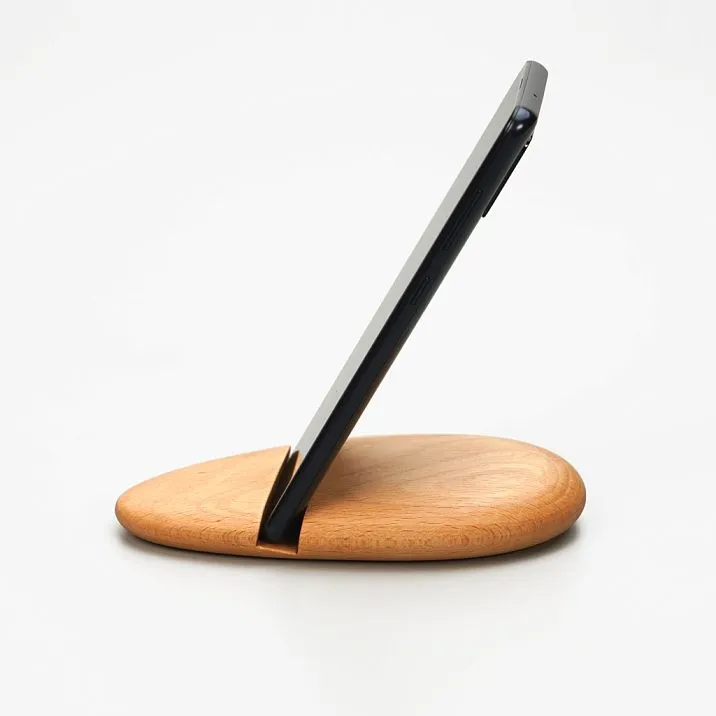 The stand features a 13 mm wide slanted slot for phone placement. Made from solid blocks of beech, oak, and ash, it is finished with colorless oil.