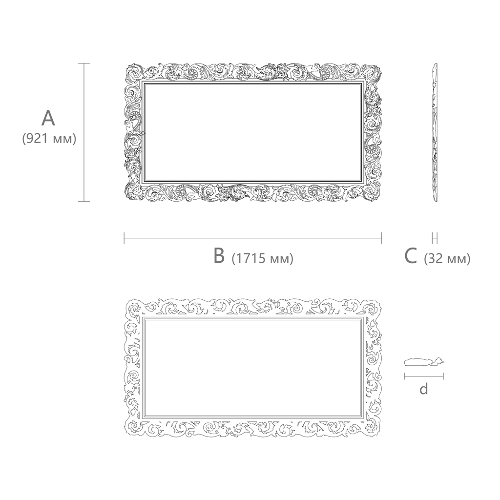 Carved wooden frame RM-014. Suitable for framing pictures and mirrors. Executed in an elegant Baroque style, adorned with intricately detailed floral patterns. The wooden frame RM-014 is ideal for designing interiors of prestigious living rooms, halls, offices, and bedrooms. This carved piece beautifully complements ornate-legged side tables, elegant lamps, and exclusive decorative items.