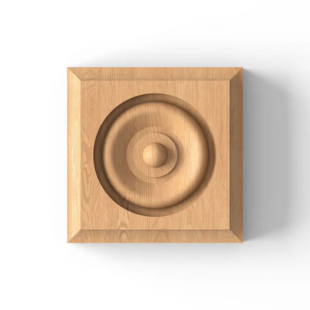 Geometric wooden rosette R-012 with round medallion — a universal decorative element for furniture and interior projects. A simple and minimalist option for decorating doors, moldings, pilasters, writing desks, wall panels, fireplaces, beds, staircase balusters, coffered ceilings. Can serve as a minimalist accent in classic or modern style projects. Also, the item pairs well with more complex carved decoration. Decorative rosettes R-012 can be purchased in oak and beech.