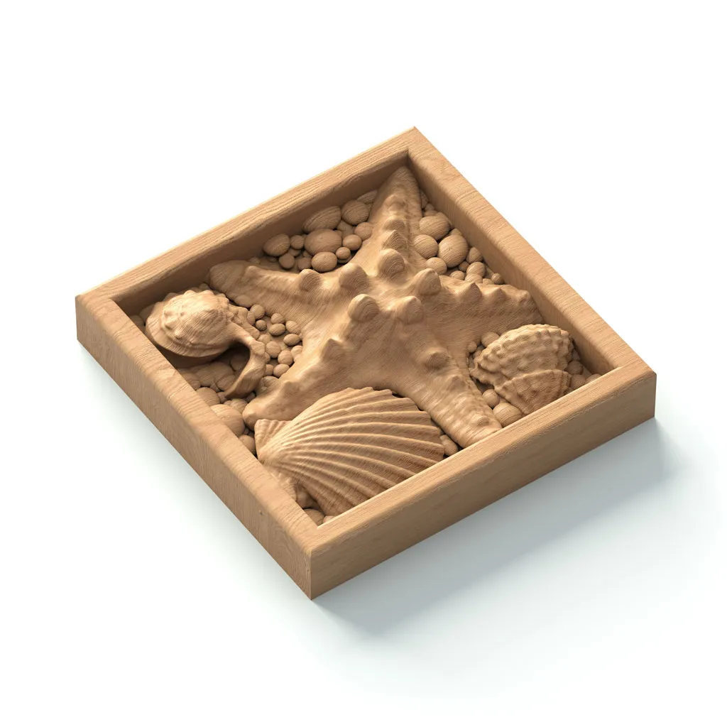 Wooden Rose R-083 — a square element with a raised shell pattern in a nautical style. The decoration is crafted with high precision detailing, looks attractive, stylish, and unique. These items perfectly match with the K-091 molding from our catalog, and differ from the adjacent rose R-082 by the shape of the shells. Surface-mounted wooden roses R-083 look interesting on facades, doors, wall panels, pilasters, and moldings.