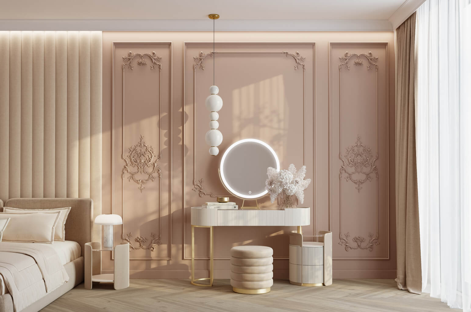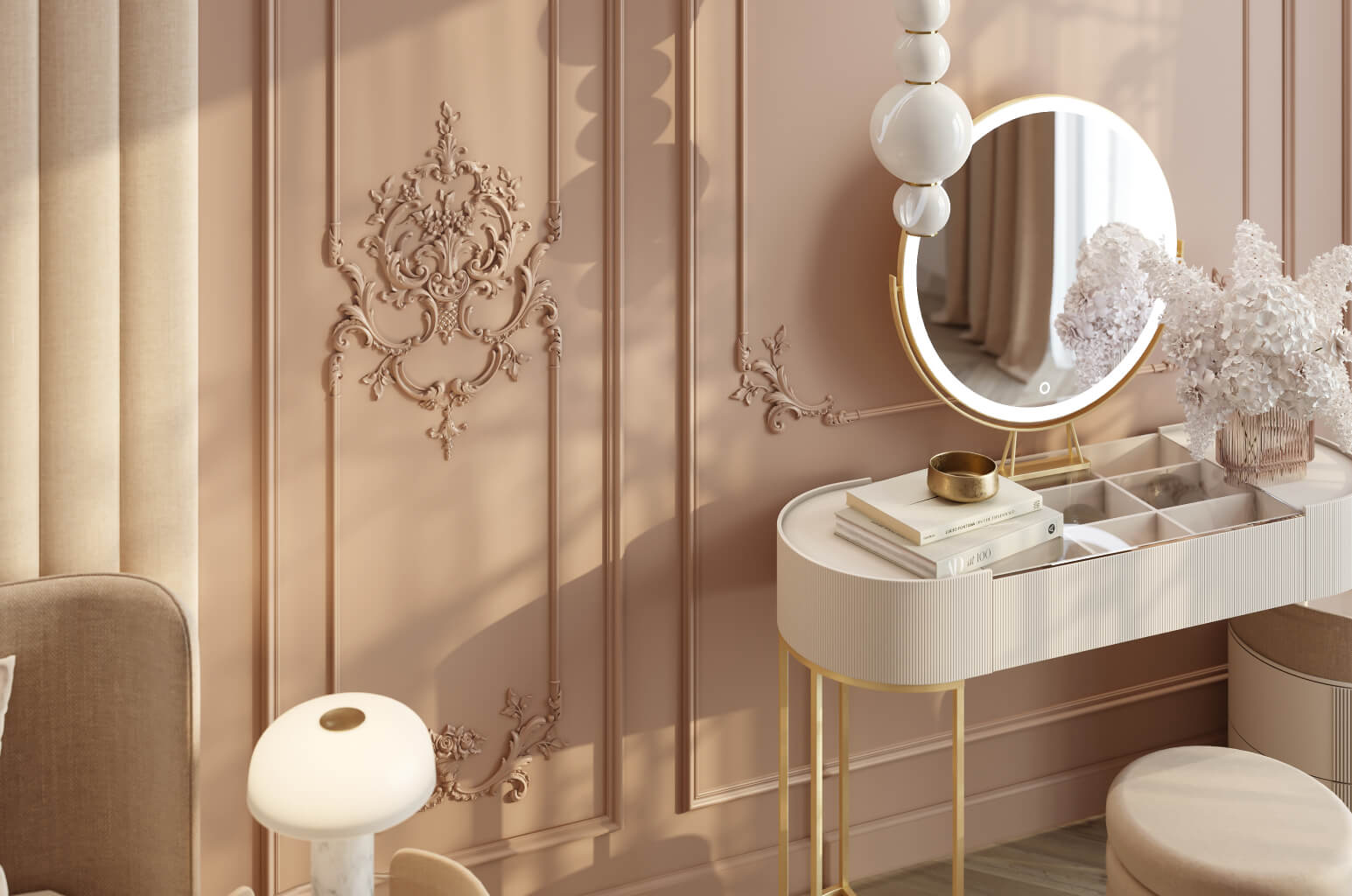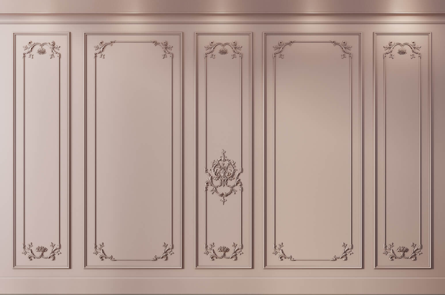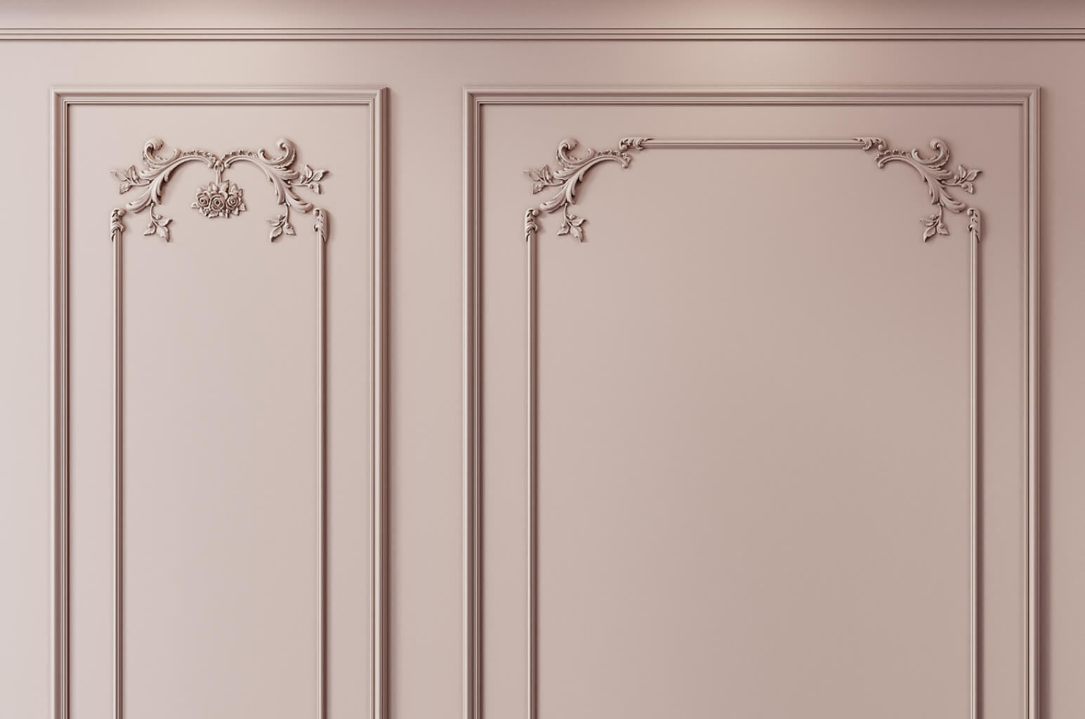 Рококо и французская классика. Кремово-белые или слегка золочёные панели в тон светлым стенам воссоздают атмосферу малых апартаментов Людовика XV: нежный природный орнамент рококо в деликатных рамках, лирически лёгкий и уютный. Частичная золотая патина на орнаментальных декорах при белых молдингах и светлом фоне — классический приём французского рококо, создающий богатый, тёплый образ.