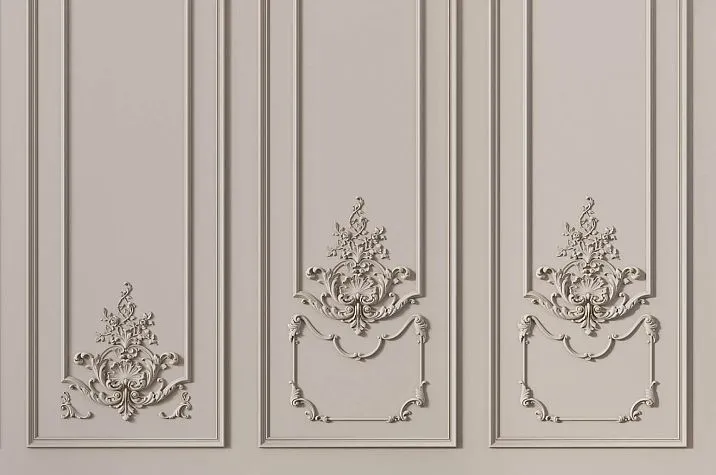 Именно эту многоуровневую архитектурную логику воспроизводит коллекция «Версаль» в полном объёме. Широкие комплекты серии CPU-5 шириной 650 мм — это версальские орнаментальные секции с медальонами и горизонтальными поясами. Среднеформатные комплекты шириной 300 мм — полупилястры и обрамляющие элементы. Узкие полосы шириной 150 мм — лопатки и вертикальные разделители. Молдинги трёх профилей — несущий рамочный каркас системы. Всё это — не случайный набор изделий, а продуманная, архитектурно обоснованная система, в которой каждый элемент знает своё место и свою функцию, и все вместе они способны воссоздать тотальную версальскую орнаментальную программу в любом современном пространстве.