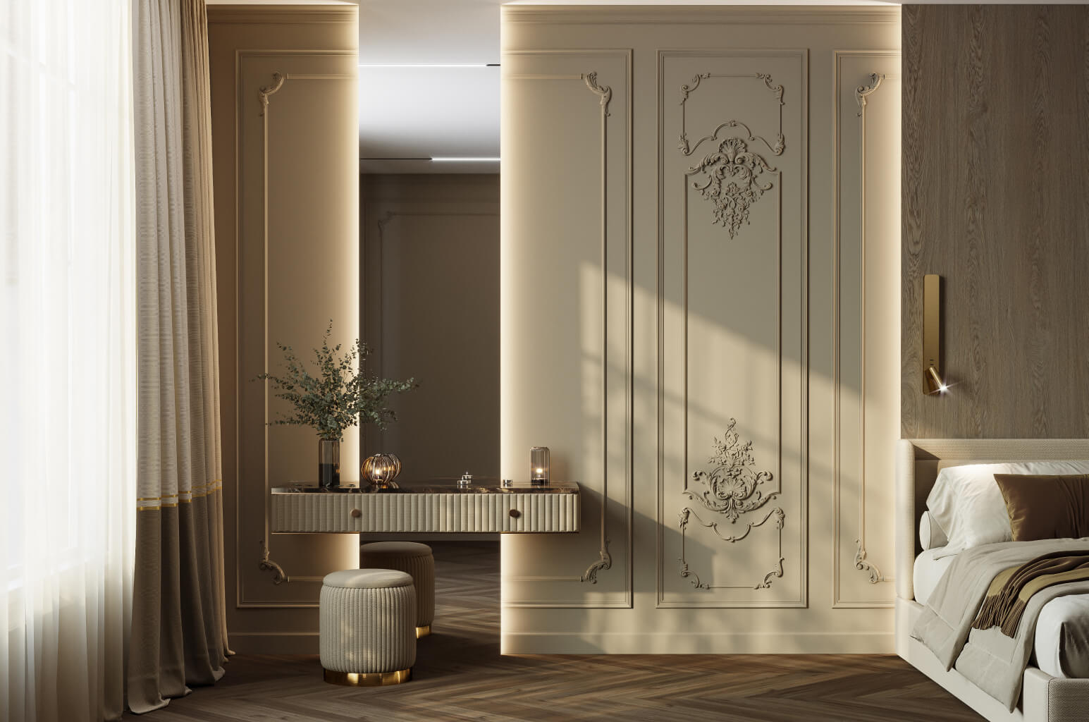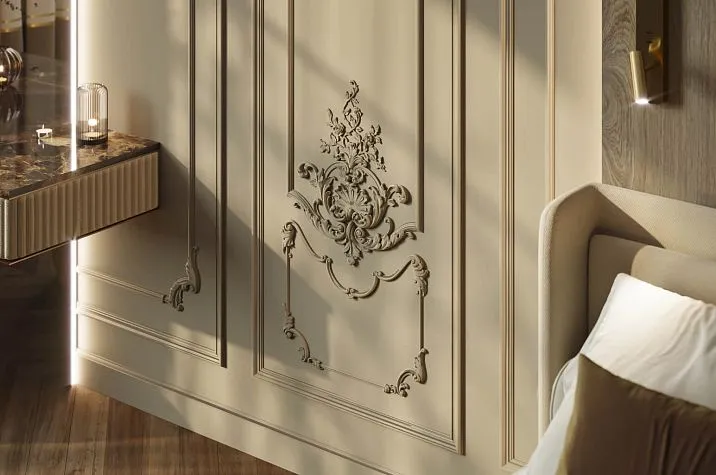 Полиуретановые декоры коллекции «Версаль» идеально подходят для оформления мебельных фасадов: дверцы шкафов, фасады комодов и буфетов, рамки зеркал, панели кроватных изголовий. Небольшие орнаментальные элементы серии NPU.VRS создают изысканное декоративное убранство мебели в той же стилистике, что и стеновые панели, — и это стилистическое единство является одним из главных признаков профессионально разработанного интерьера.