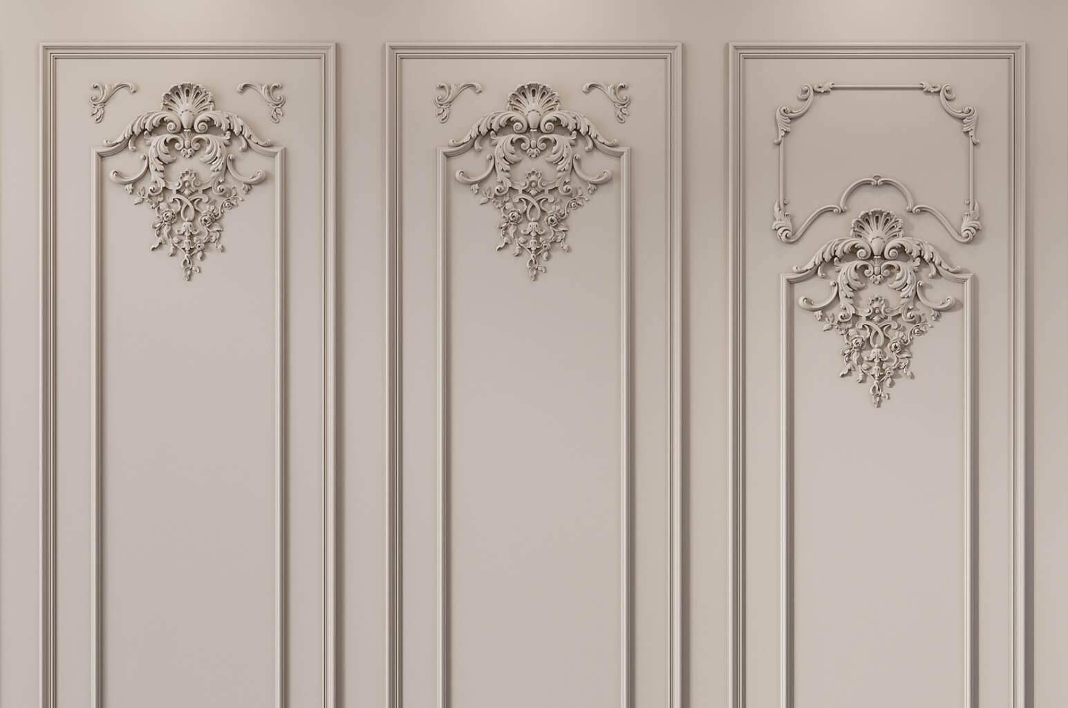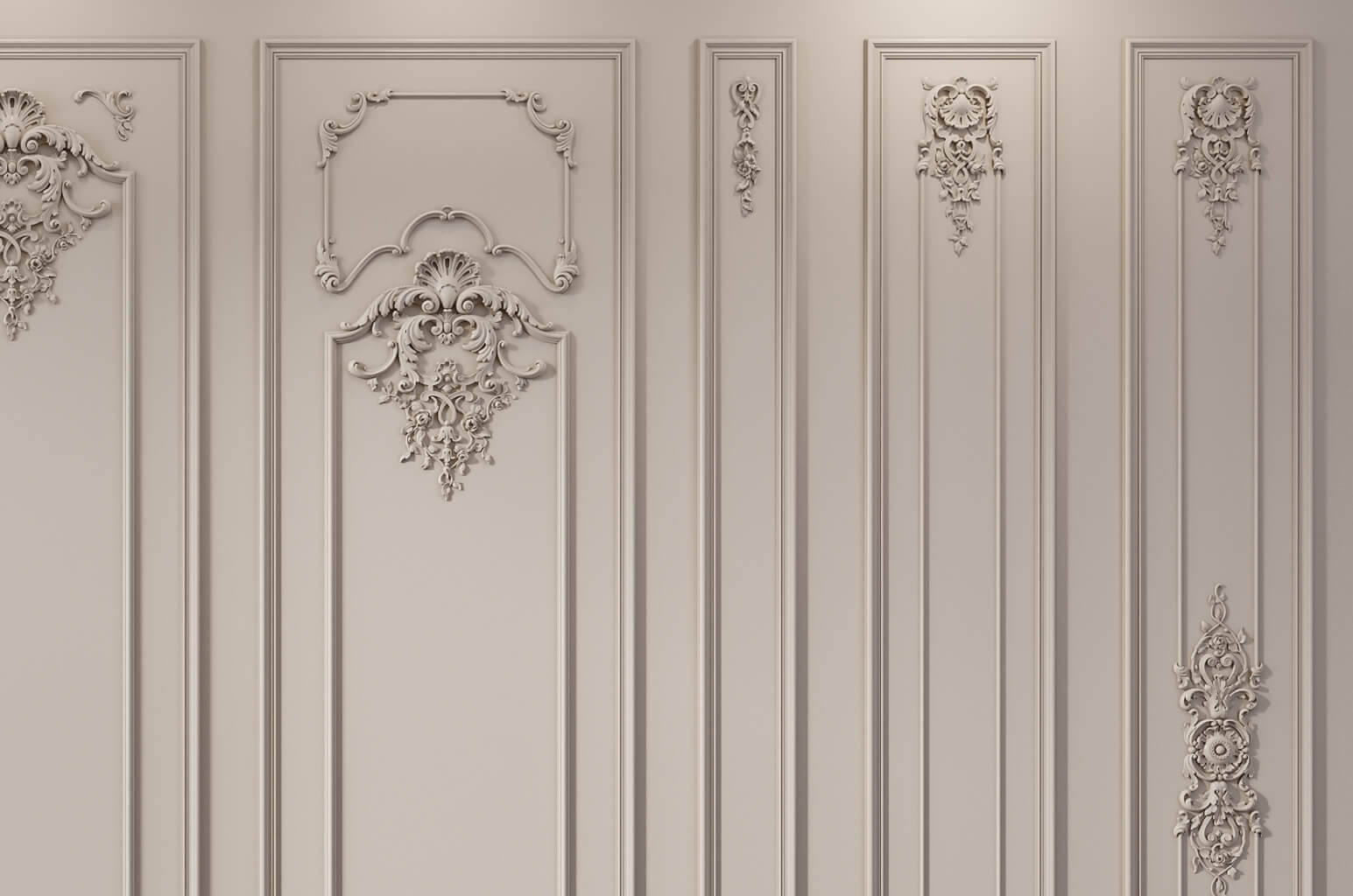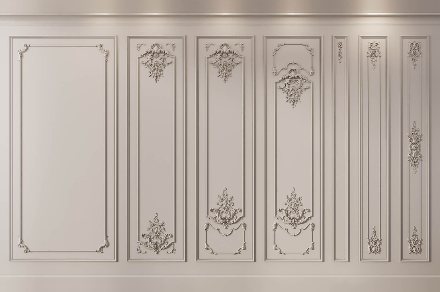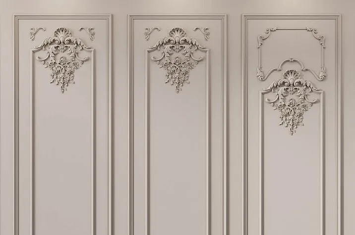 Широкие комплекты формата 650 × 2300 мм создают полноформатные версальские стеновые секции с максимально богатым орнаментальным убранством: горизонтальные декоративные пояса структурируют внутреннее поле, центральные медальоны наполняют его скульптурным содержанием, рамочные орнаментальные накладки создают дополнительный орнаментальный уровень, угловые акценты детализируют все переходные узлы системы. Среднеформатные комплекты 300 × 2300 мм обеспечивают полноценную орнаментальную программу в компактной ширине — оптимальное решение для узких простенков, обрамления проёмов и самостоятельного декорирования небольших помещений. Узкие полосы 150 × 2300 мм работают как изящные ритмические разделители или самостоятельные акцентные вертикали в пространствах, где широкие форматы неуместны.