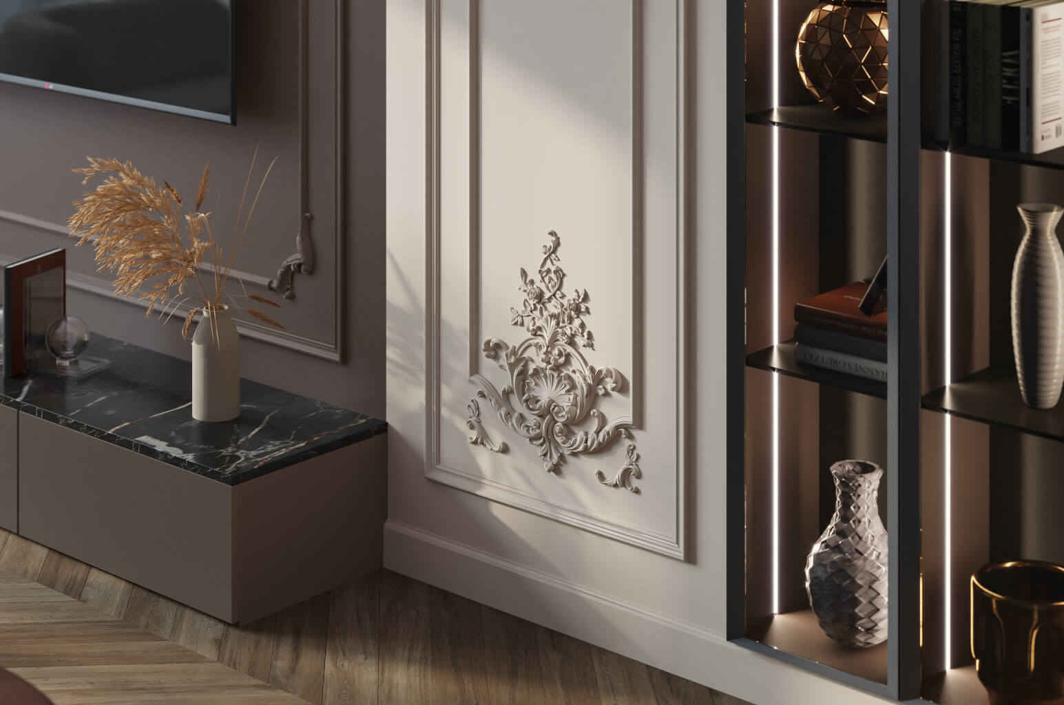 Современная классика и transitional. Минимальное, точечное применение отдельных панелей или полос коллекции «Версаль» как декоративных акцентов в преимущественно нейтральном современном интерьере — один-два комплекта CPU-5-2 или CPU-5-3 на главной стене гостиной при чистых стенах остальных — создаёт сдержанное, элегантное высказывание, в котором классический орнамент является знаком культуры и вкуса, а не декоративной перегрузкой.
