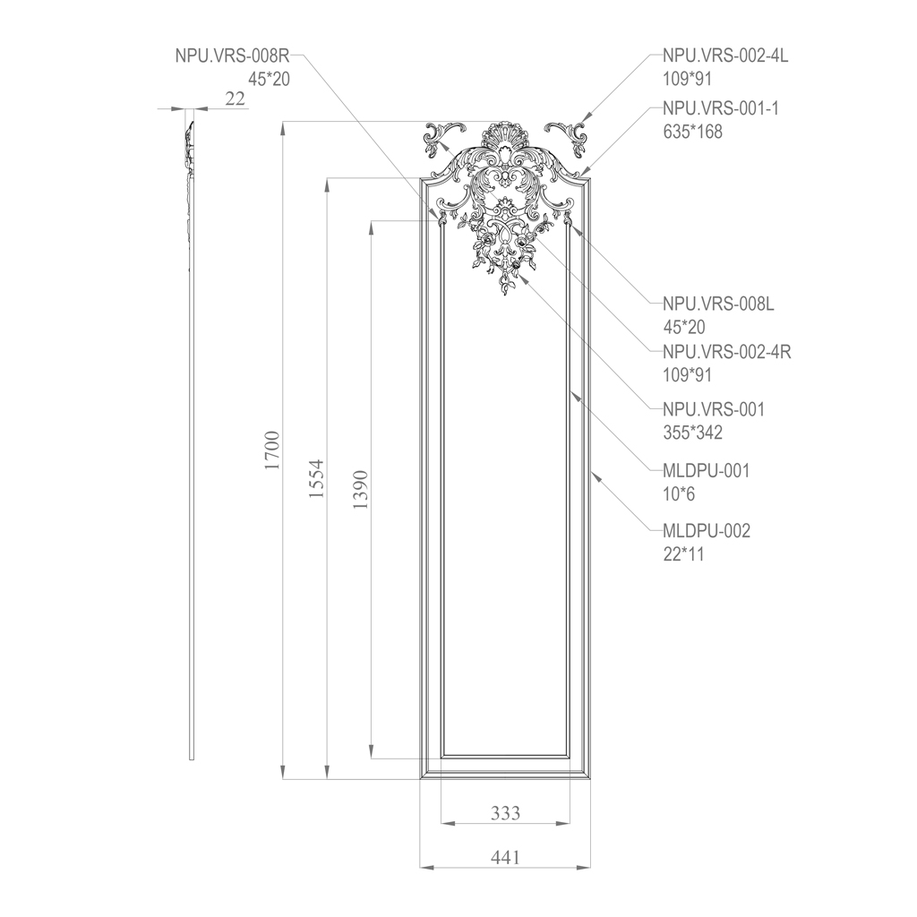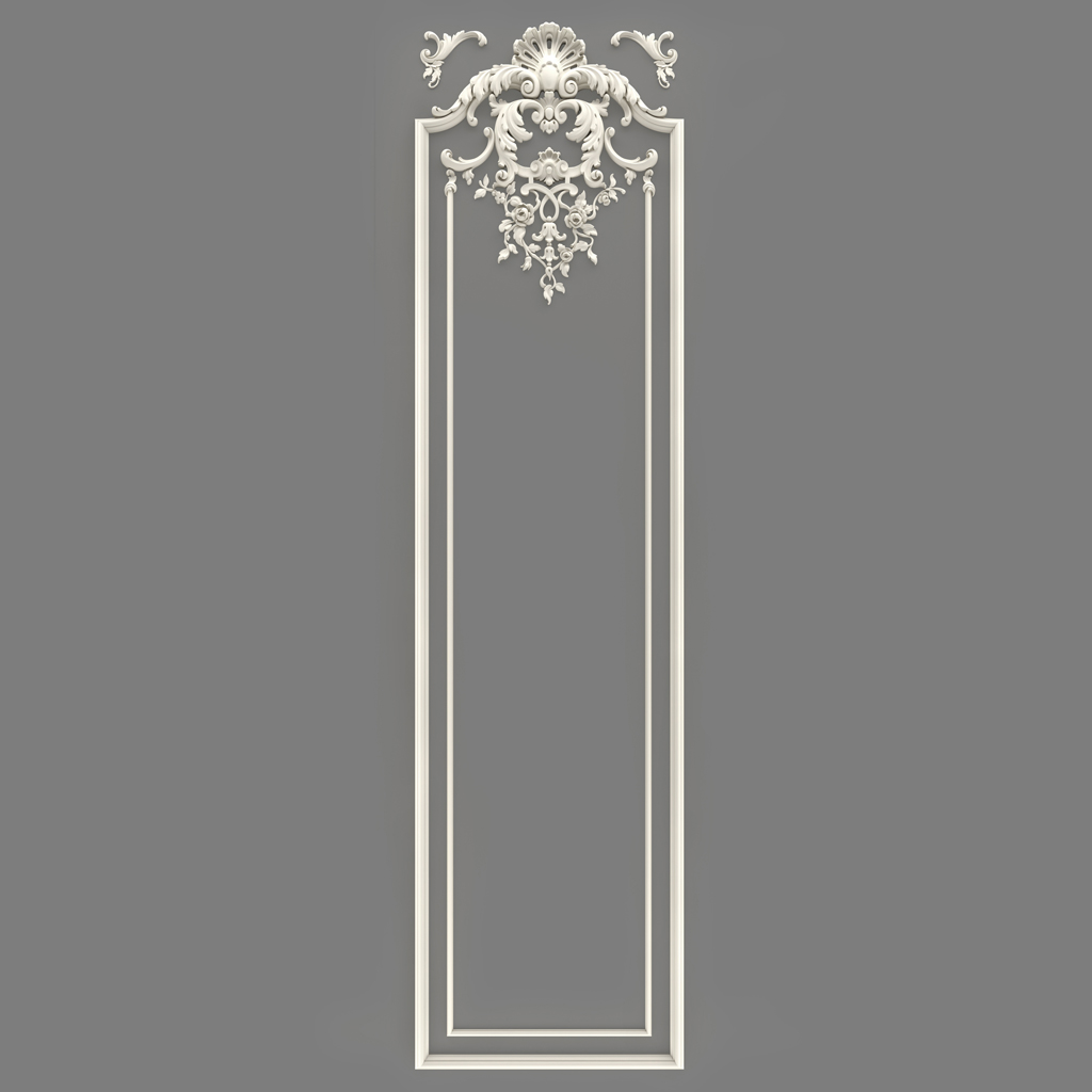 Relief Decoration CPU.VRS-060 is a complete set of several elements that, when combined, form a tall and narrow decorative panel. This panel can be used on walls, doors, and under certain conditions — even on facades. Thanks to its complex ornamentation, including floral motifs, scrolls, shells, and other classical details, this decoration immediately attracts attention and becomes the central accent of the space.