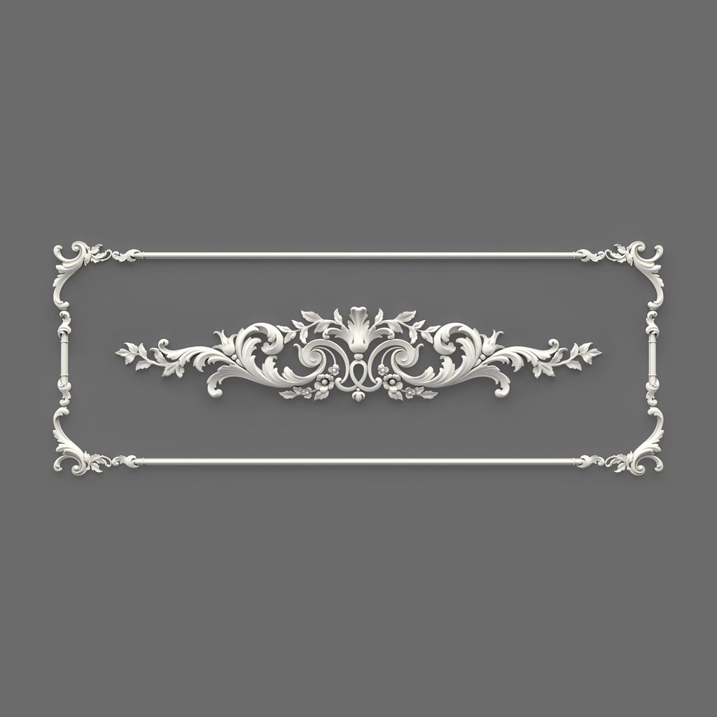 The central ornament of the CPU.VRS-064.1 panel unfolds in a horizontal arabesque characteristic of French Rococo, with axial symmetry and increasing relief density from the edges to the center. The structure of the ornament is built on a principle well-known to anyone who has studied the decorative programs of European palaces: from the central semantic core, branching shoots with leaves, flowers, and scrolls radiate in both directions, gradually losing density towards the edges and giving way to framing elements. The central motif — a palmette or shell with vertical ribs, traditional for Baroque and Rococo — crowns the entire composition and serves as its visual axis, around which the rest of the ornamental space unfolds symmetrically. From the central node grow large acanthus leaves with the soft, almost living plasticity characteristic of Rococo — they are not inscribed in a rigid geometric scheme but seem to choose their own direction of growth, curling into spirals, unfolding in volume, and engaging in dialogue with neighboring elements. Floral garlands and individual flower heads — roses, buds, inflorescences with petals of varying degrees of openness — are woven into the ornament with the precision characteristic of mature Rococo: not as a decorative stencil, but as an imitation of living nature captured at the moment of maximum bloom. Twining shoots fill the space between large elements, binding them into a single ornamental fabric without voids or breaks. Around the perimeter, the ornament is inscribed within a framing contour formed by a molding with a fine profile — it fixes the panel's boundaries and creates a clear architectural silhouette, without which even the richest ornament would be perceived as a chaotic accumulation of details. The corner nodes of the frame are resolved with figured corner overlays with Baroque scrolls — they accentuate the transitions of horizontal and vertical lines and add ornamental detailing at the intersection of axes. The relief, with a maximum depth of 18 mm, ensures full sculptural volume for the entire composition: under side lighting, every leaf, every scroll, every petal luxuriously lives in its own shadow.