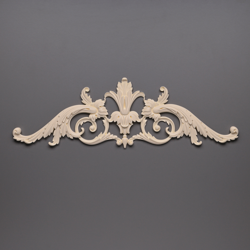 Architectural element with a highly detailed central ornament and symmetrical side wings. Polyurethane base ensures precise pattern geometry, moisture resistance, and mechanical strength. Clear contours of each carved element.