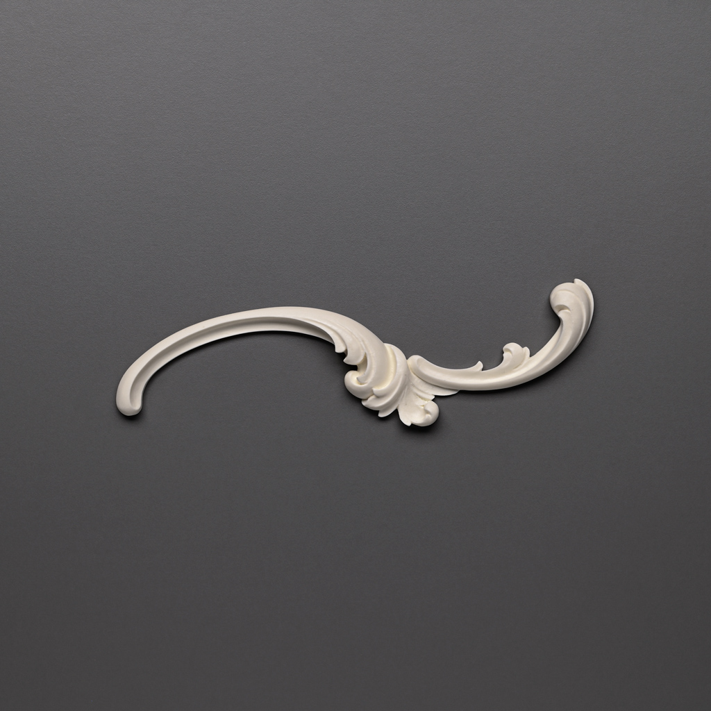 NPU-430R Molded Decoration is an elegant swirl with soft transitions and smooth curves, reminiscent of luxurious botanical motifs. The central part of the model appears more substantial, while it tapers toward the edges, giving the entire composition lightness and dynamism. Thanks to this shape, the decoration is ideal for creating accents on walls, ceilings, furniture, or facades.