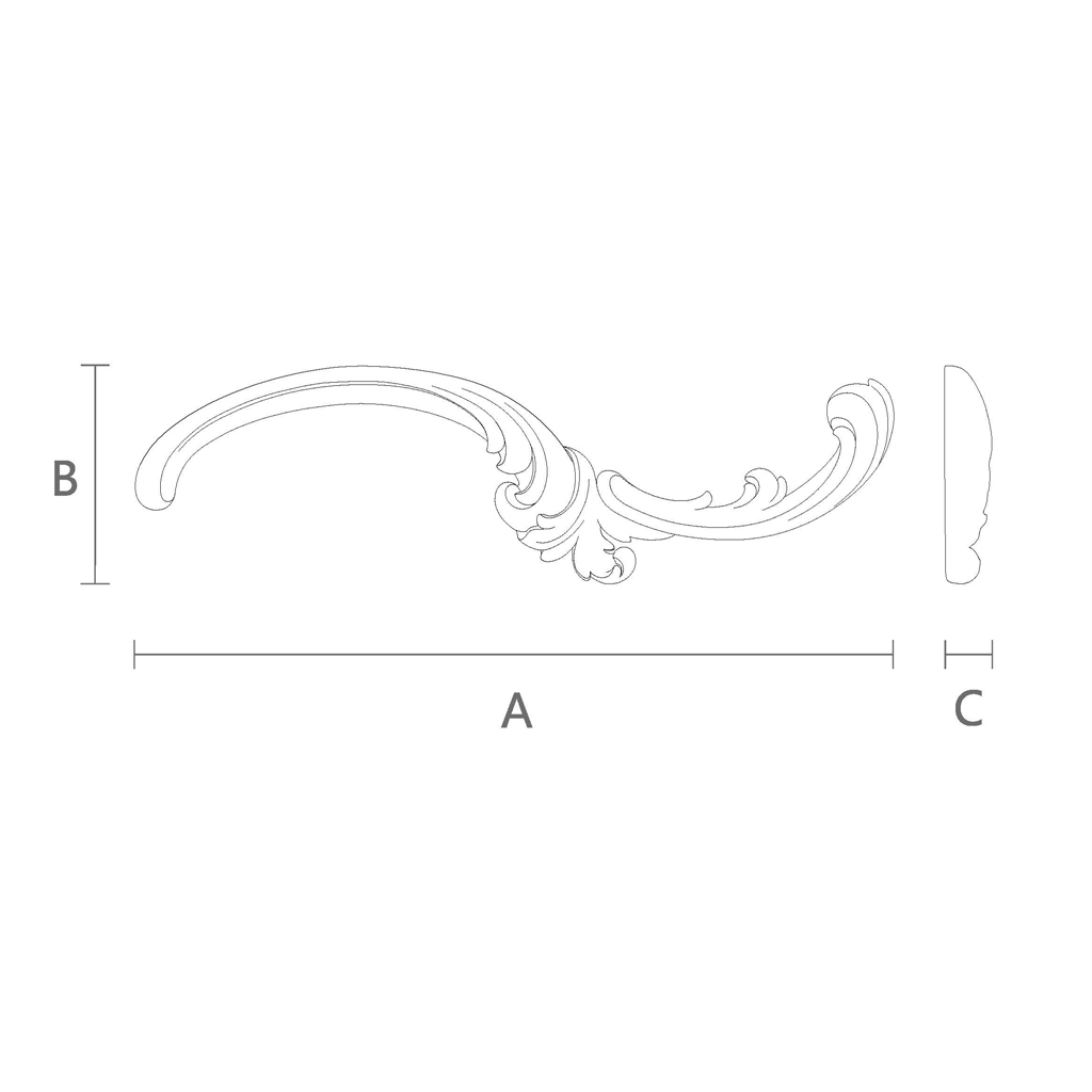 According to the schematic illustration, the NPU-430R decoration element has a curved shape, where one side is more elongated, and the other ends in a characteristic swirl. This allows combining the decoration in different directions: using it individually or creating mirror pairs (with the element for the left side), forming symmetrical patterns.