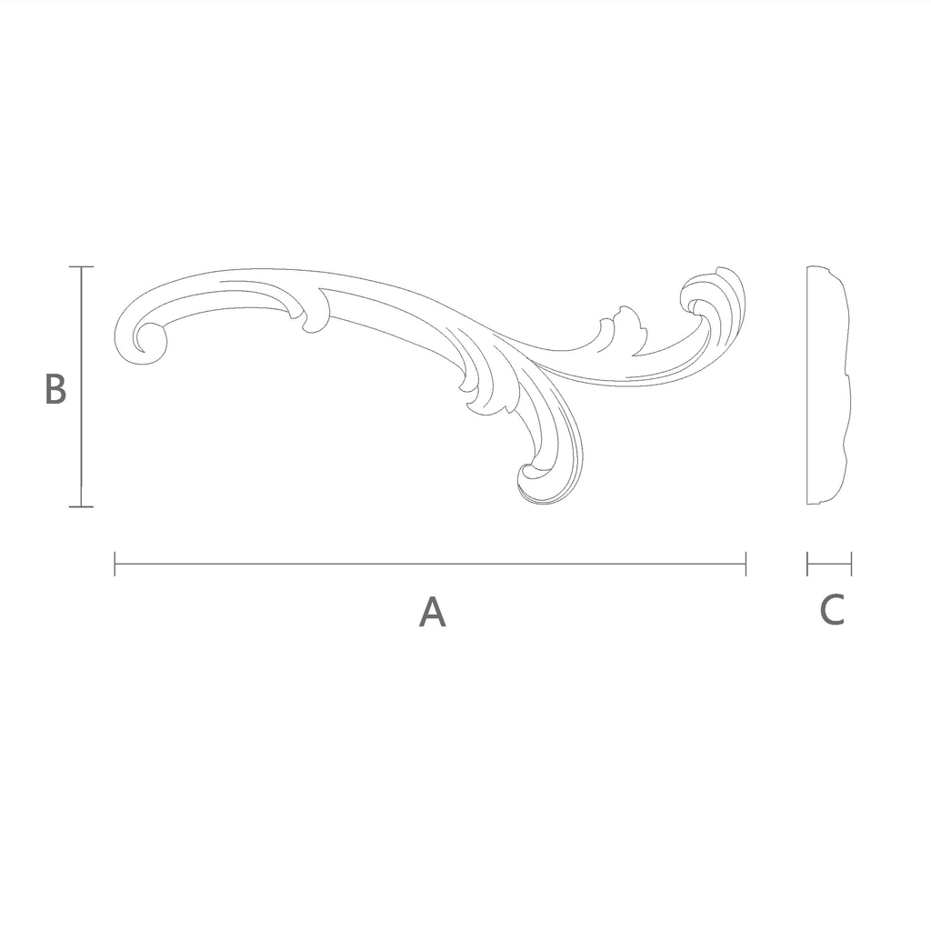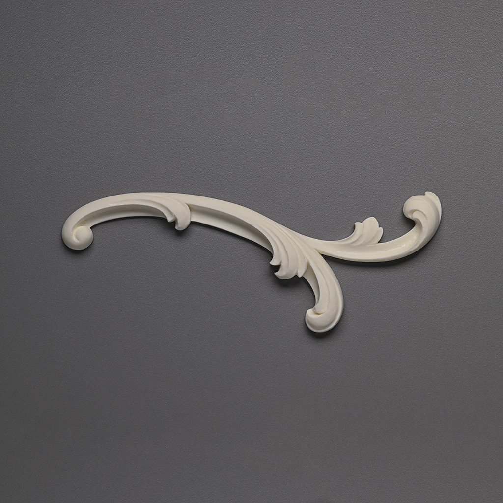 The shape of NPU-433R is a curved arch with soft scrolls. The main line slightly thickens toward the center, then gracefully curves outward, forming an expressive 'branch' with one larger leaf accent and additional small elements. Thanks to its thoughtful asymmetry, the NPU-433R molded decoration looks great both as a single piece and paired with a mirrored element (e.g., NPU-433L), creating a symmetrical composition.