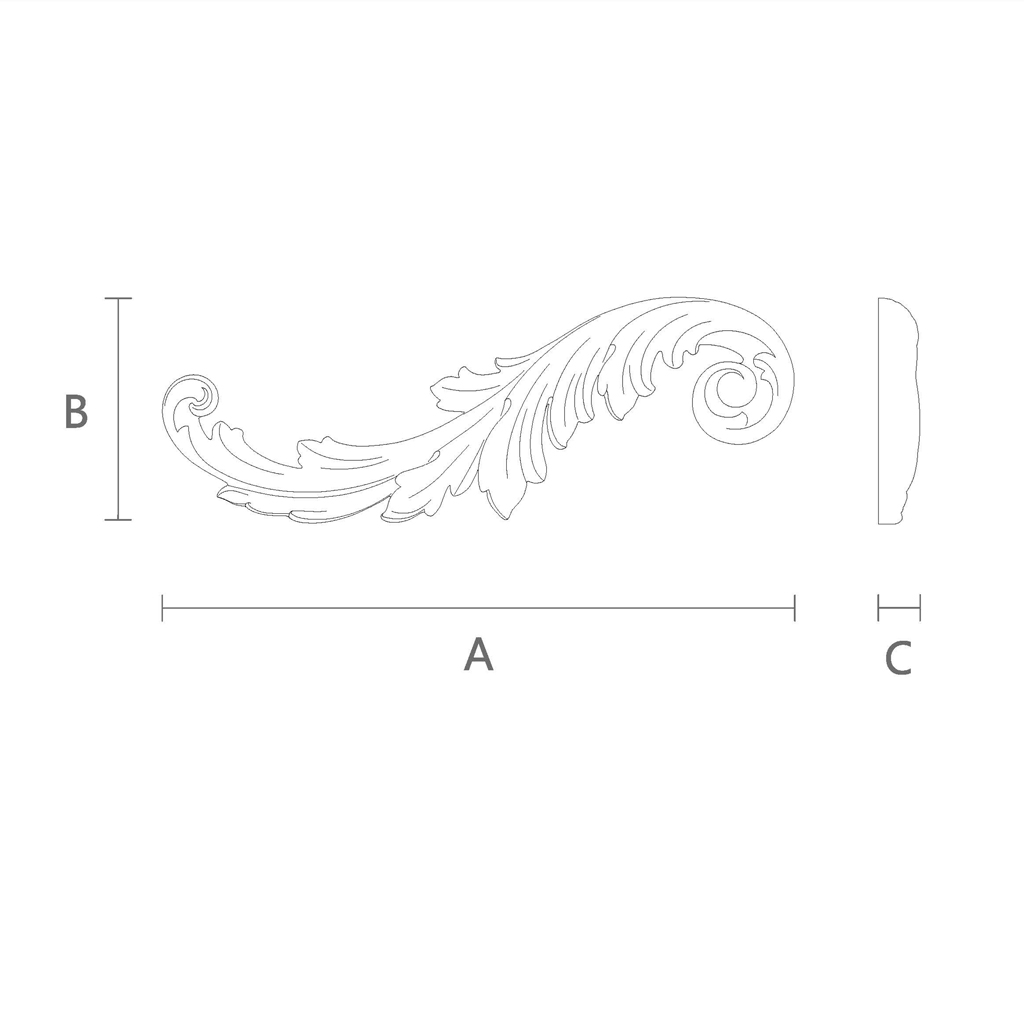 According to the schematic drawing, the decoration has length (A), height (B), and a small thickness (C), giving it an expressive relief without excessive bulk. Thanks to this, relief decoration NPU-458L can be used as a single element on a wall or ceiling, or in combination with other scrolls or molded decoration elements, if you wish to create a more complex composition.