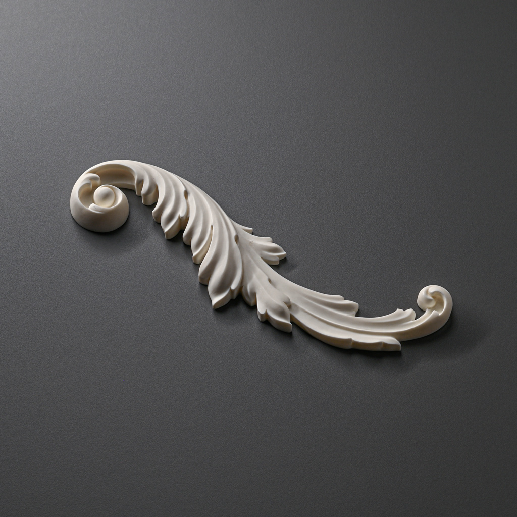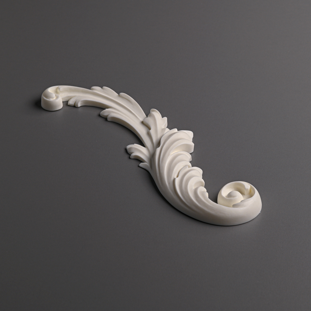 Relief Decoration NPU-458R is an elegant applique shaped like an elongated scroll with leaf-like elements reminiscent of Rococo or Baroque ornaments. The decoration’s shape features a smooth transition from one scroll to another, with relief emphasized by neat lines that create an impression of lightness. At the top of the decoration, you can notice a small spiral smoothly transitioning into a leaf with a curled edge, which gives the model dynamism and elegance.