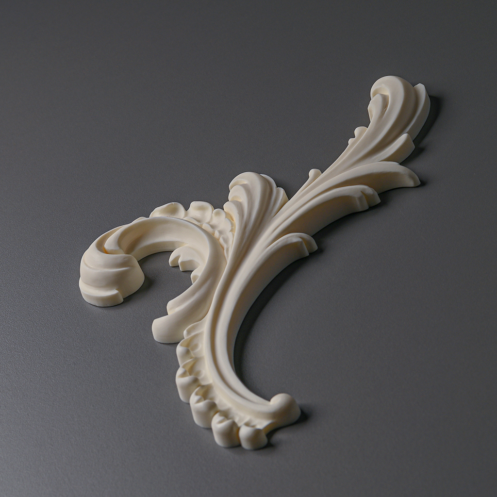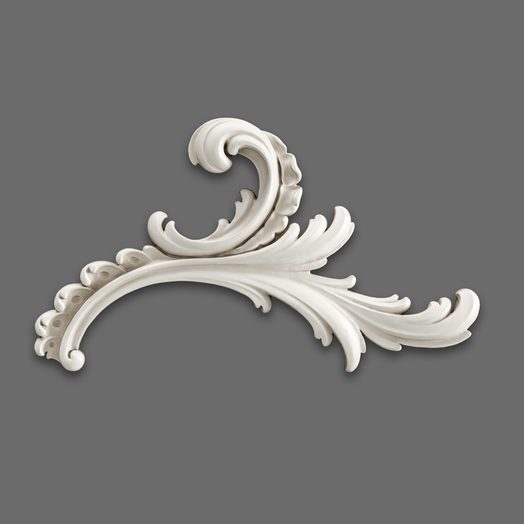 The NPU-461R relief decoration resembles a curved acanthus scroll with a smooth transition from one leaf to another. Attention is drawn to the clear detailing: leaf edges are neatly curled, and inner parts are prominently emphasized, giving the decoration depth and dynamism. Thanks to this design, the model fits well into classic interiors, but can also become a striking accent in modern spaces if properly placed and mounted.