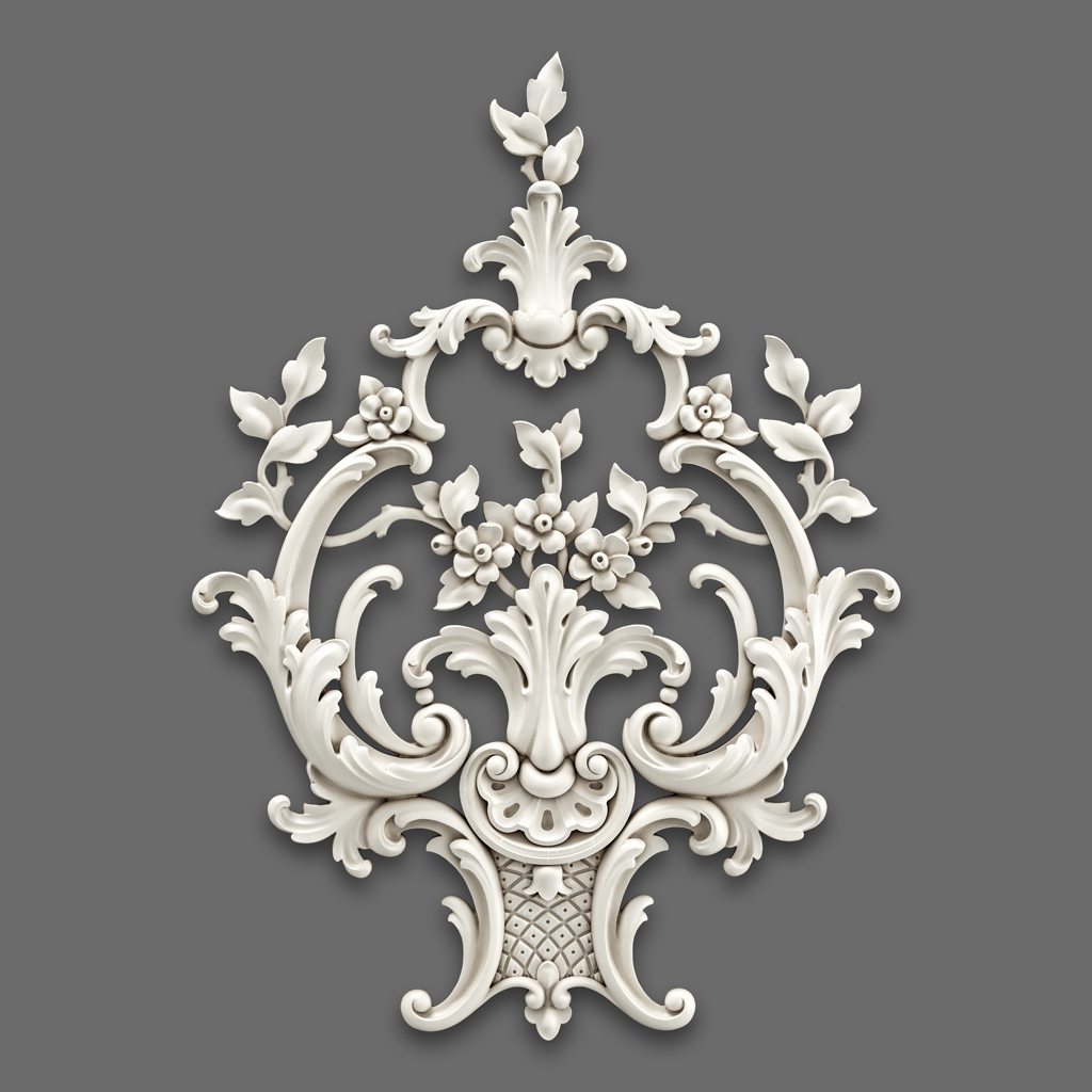At first glance, NPU-464 Molded Decoration impresses with its multi-level structure and refined composition. In the center of the composition, you can notice elegant floral motifs framed by lush scrolls and leaves. The top part is crowned with a distinctive 'crown,' giving the decoration a sense of completion and grandeur. The lower part resembles a basket with a mesh pattern, from which 'acanthus leaves' and other plant elements seem to grow. All of this creates a harmonious and balanced structure that appears both dynamic and balanced.