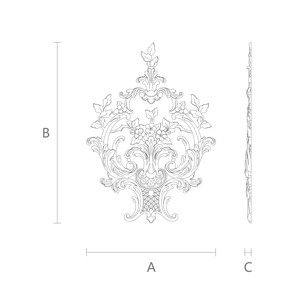 According to the drawing, NPU-464 Molded Decoration has specific dimensions: width (A), height (B), and thickness (C). Despite its impressive relief, the thickness of the decoration is not excessive, allowing it to be installed even in rooms with standard ceiling heights. The proportions are well-balanced, meaning the decoration will look appropriate and not overwhelm the space.