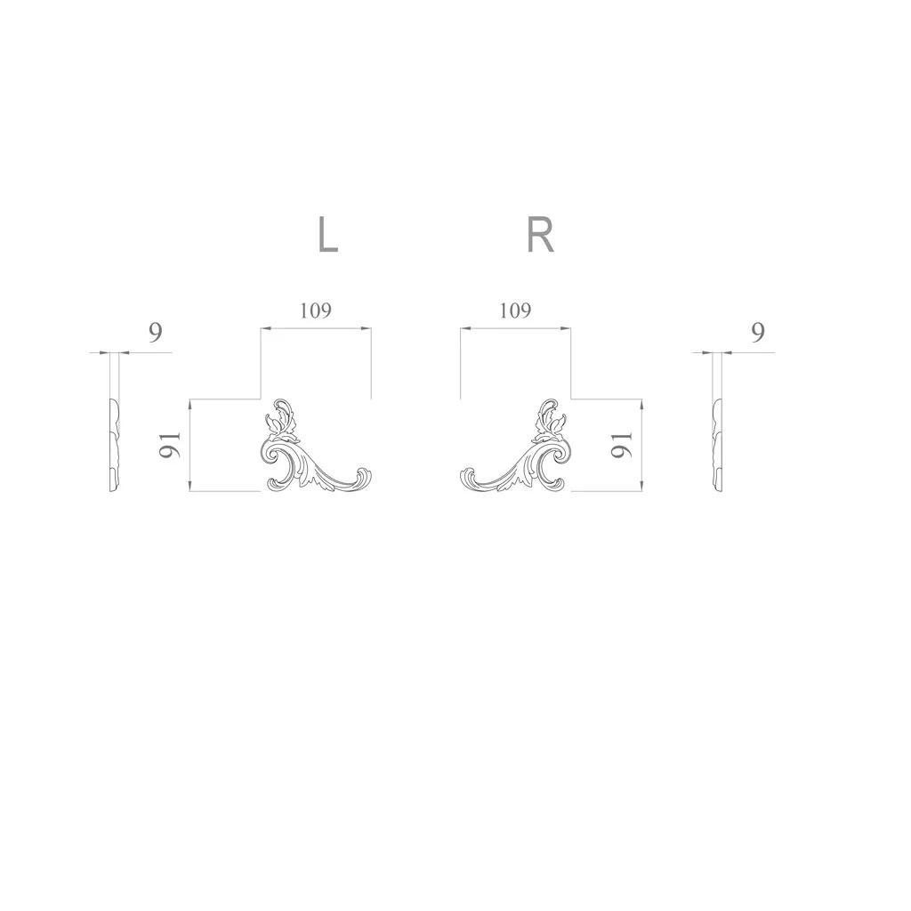 First of all, it should be noted that NPU.VRS-002-4L — this is not just a swirl or volute. It is a carefully designed decorative element, created according to classical ornamentation canons, yet adapted to modern manufacturing technologies. On the presented photos, you can notice its smooth curves, plant motifs, and elegant lines, capable of complementing both classic and modern interiors. Material: Polyurethane, distinguished by increased wear resistance and longevity. It is not afraid of moisture, does not rot or deform, and also does not absorb odors. Dimensions: Height (B) — 91 mm, Width (A) — 109 mm, Depth (C) — 9 mm. These dimensions allow the element to easily fit into various architectural zones: door frame corners, portals, niches, wall panels, ceiling cornices. Style: Classic plant ornament. Curved leaves and smooth volutes give the interior a light grandeur and artistic expressiveness. Color: Initially white (or close to white shade), which is convenient for further painting in any desired color. You can use acrylic paints, decorative enamels, and even gold leaf. Often, a mirror-symmetrical pair (left and right versions) is included in the set, allowing you to create compositions ideally suited for decorating mirrors, doorways, or wall panels. Thanks to this symmetry, decorators gain enormous creative freedom, while room owners enjoy a magnificent visual effect.Application Areas in Interior Design