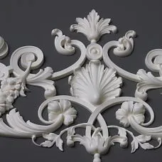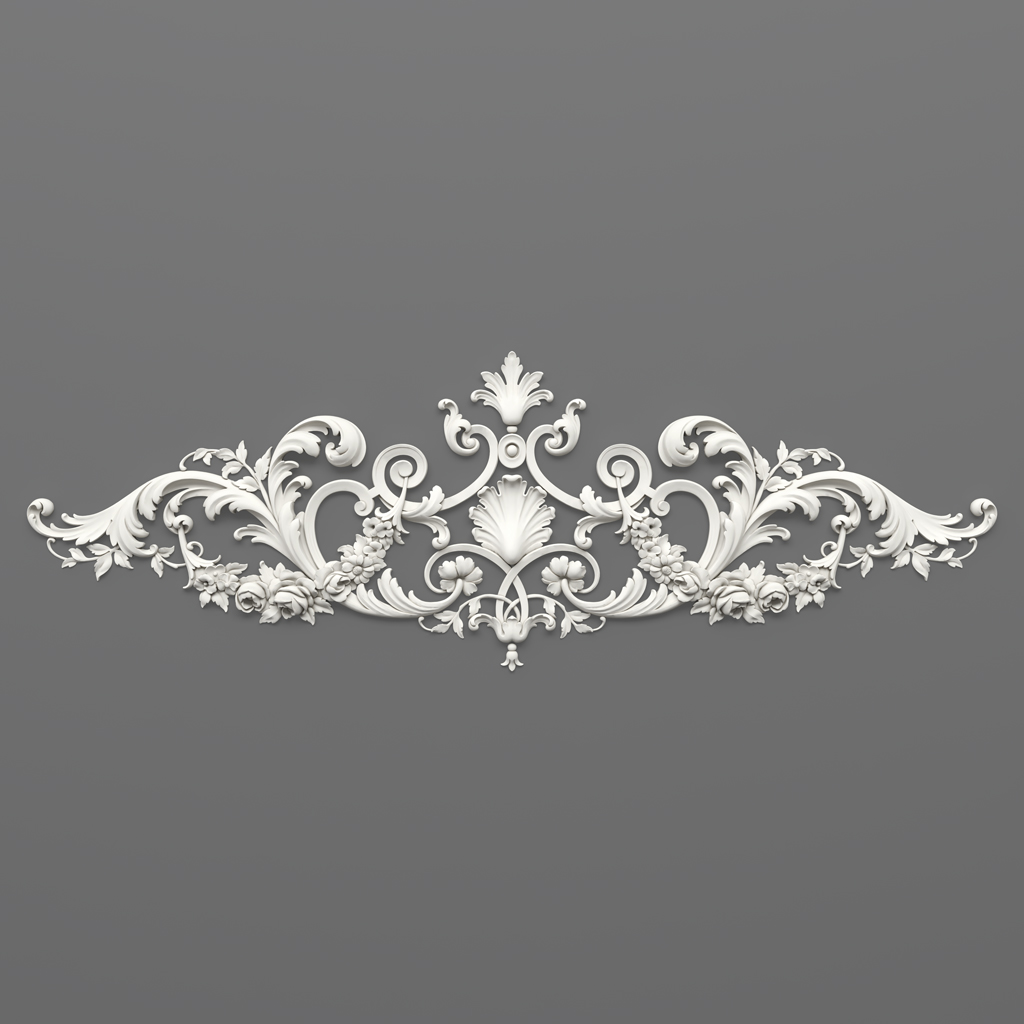 Relief Decoration NPU.VRS-006 stands out not only for its detailed pattern but also for its carefully designed composition. It can be called a "universal soloist": it is self-sufficient, yet perfectly complements other decorative overlays and moldings. Central motif. In the center of the composition — a shell with a plant ornament, which smoothly transitions into side swirls. Symmetry. The item is symmetrical relative to the central axis, simplifying its use in interiors where balance is important. Abundance of details. Leaves, floral elements, swirls — all this creates a rich relief that looks beautiful under any lighting.Style solutions