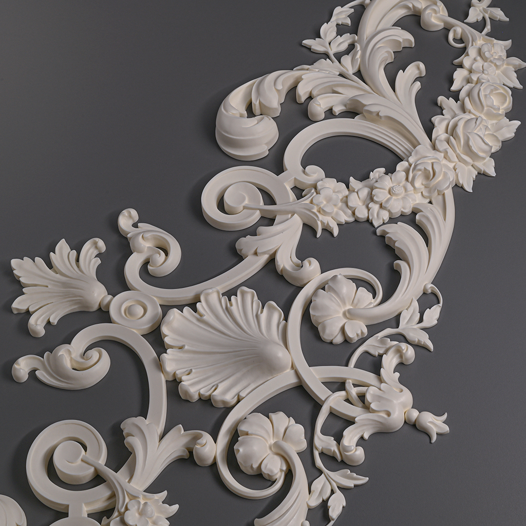 Walls: wall decoration with molded decoration Ceilings: Ceiling molding decoration Doors: Installing the overlay on the upper part of the door panel or above the doorway gives doors a majestic appearance. Furniture: Some designers take bold experiments, decorating cabinets and chests with such elements, obtaining exclusive interior items. Facades: If using denser models (or special variations), you can achieve an impressive result by applying Facade Molded Decoration. With Relief Decoration NPU.VRS-006, you can bring to life almost any idea — from classic palace style to modern fusion, where bold elements create striking contrasts.Main advantages and design features