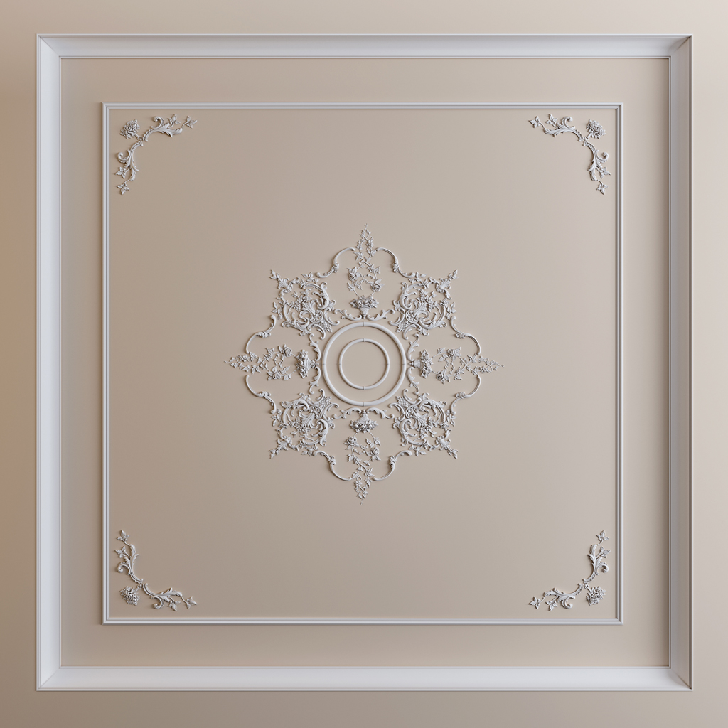 Floral elements are represented by rosettes with blooming buds, gathered in baskets and bouquets. The motif of a basket with flowers, characteristic of French Rococo, gives the composition grace and lightness, softening the monumentality of Baroque scrolls. The combination of large architectural forms with delicate plant details creates a balance between grandeur and refinement, making the rosette universal for various interior solutions.