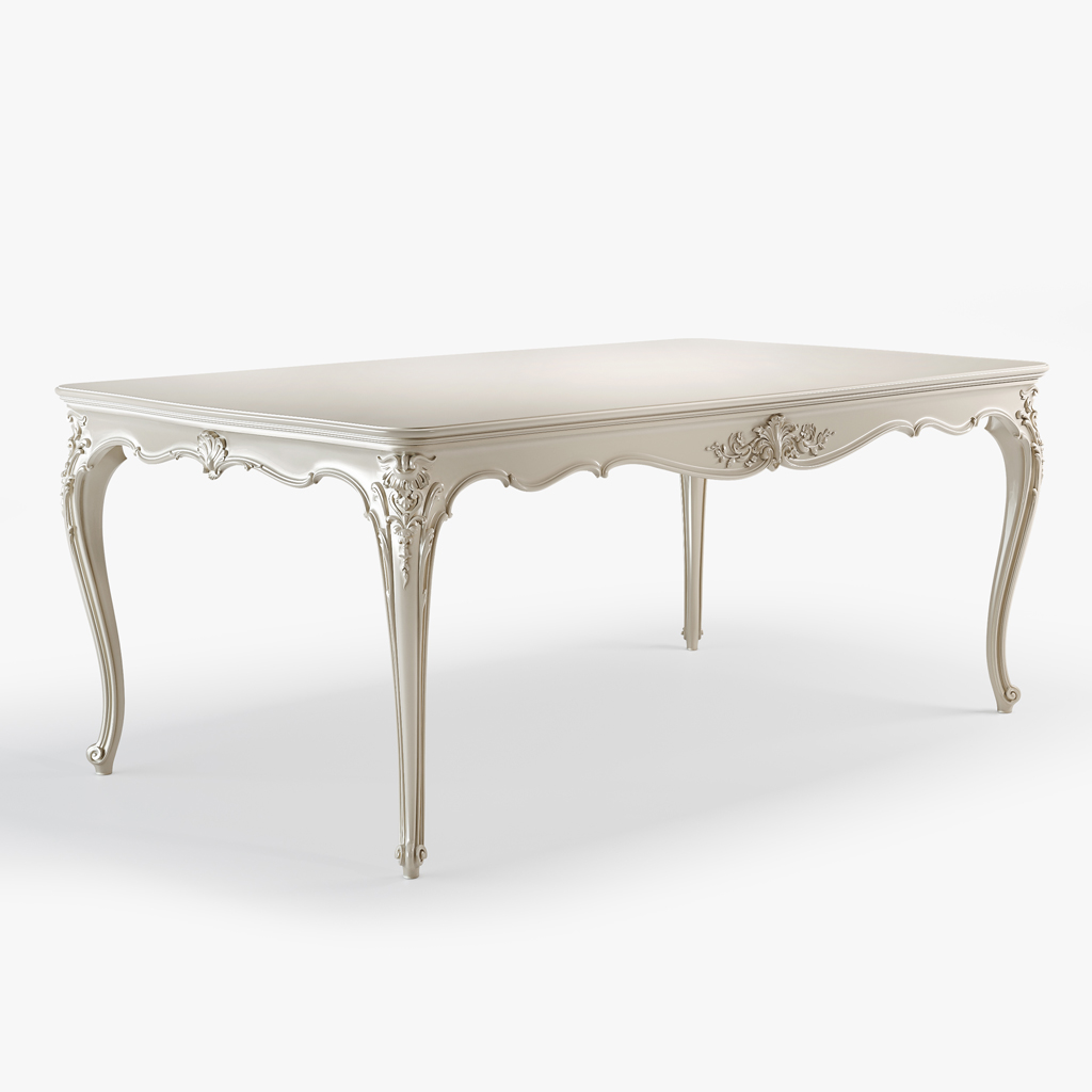 The Versailles 002-001 table features smooth, curved legs adorned with carving, complementing the overall design of the piece. The pristine white finish gives the table an airy and elegant appearance, making it look light yet sturdy in practice. Such construction is not only beautiful but also functional, providing ample legroom under the table.