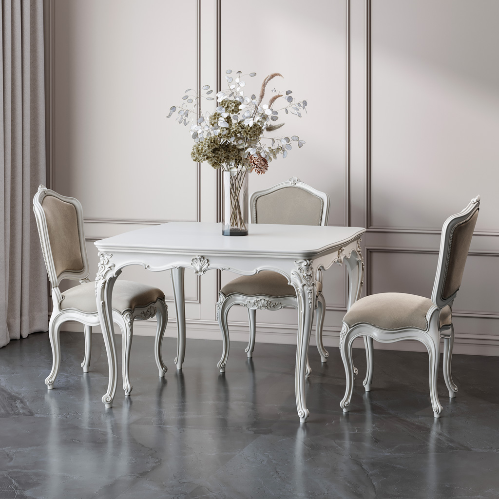 Versailles Table 002-006 is ideal for hosting festive events. Decorative elements, floral arrangements, and table settings can be placed on its surface to create an atmosphere of celebration and joy. The carved ornamentation adds a festive touch to any occasion. For special occasions, you can use a beautiful tablecloth and elegant cutlery to highlight the refined style of your home. This table will become the centerpiece of the celebration, drawing guests’ attention with its elegant design and quality craftsmanship.