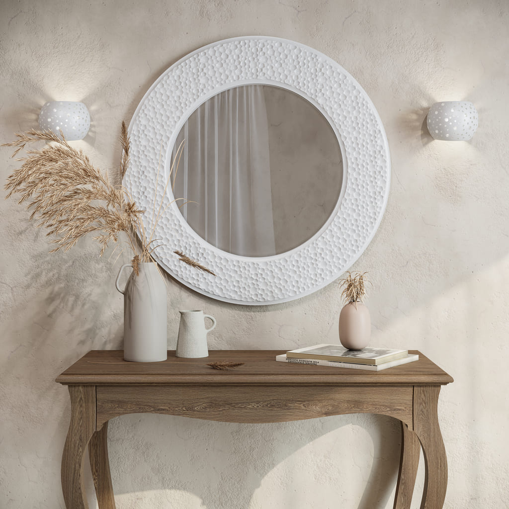 Mercury 008-006 Mirror It is an embodiment of elegance and harmony, enclosed in a circular form reminiscent of a full moon. Its frame, crafted from high-quality MDF, skillfully imitates wood texture, creating an illusion of natural material. This artwork seems to transport us to a world of nature, where every detail is filled with care and attention to detail. The frame’s texture, like the surface of water covered with gentle ripples, creates dynamism and liveliness, making the Mercury 008-006 mirror a unique decorative element.