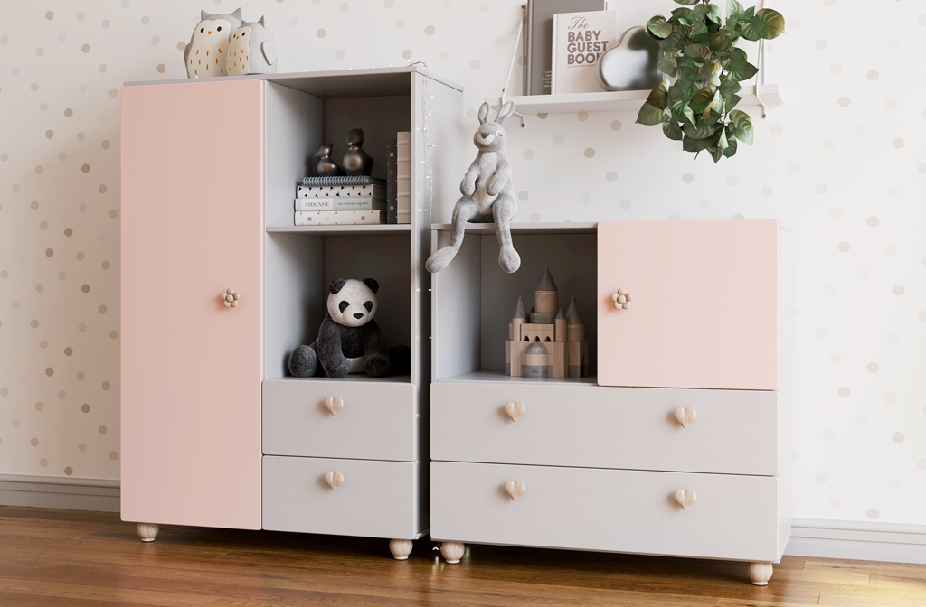 С помощью комода KMD-008 можно создать в детской комнате атмосферу игры и творчества. Использование ярких декоративных элементов, таких как ручки "Цветок" и "Сердце", делает комод не только полезным, но и привлекательным для детей. Он может стать частью игры, помогая ребёнку развивать воображение и креативность.