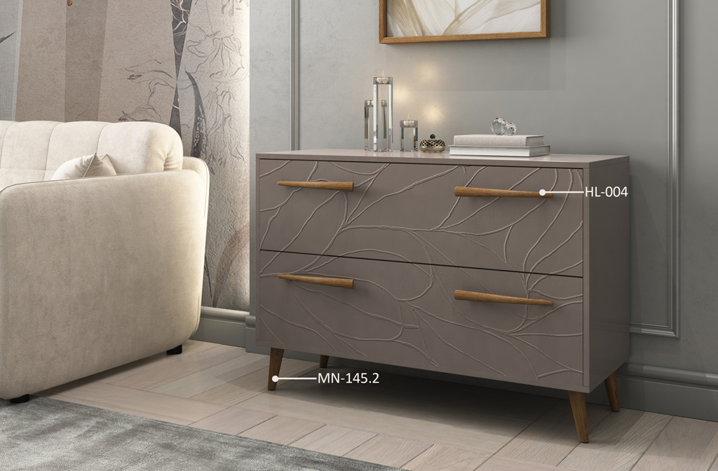 Ручка HL-004 не только эстетически привлекательна, но и очень удобна в использовании. Её плавные линии и гладкая поверхность делают процесс открывания и закрывания ящиков комода приятным и лёгким. Эта ручка становится не просто функциональной деталью, но и важным декоративным элементом, который завершает образ стильного комода в современном стиле.