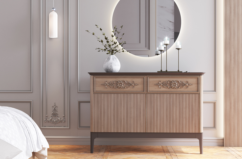 Резные накладки подчеркивают текстуру и форму комода, делая его более изысканным и утончённым. Такие декоративные элементы особенно актуальны для тех, кто стремится создать стильный комод в современном стиле, который станет важным акцентом в интерьере.