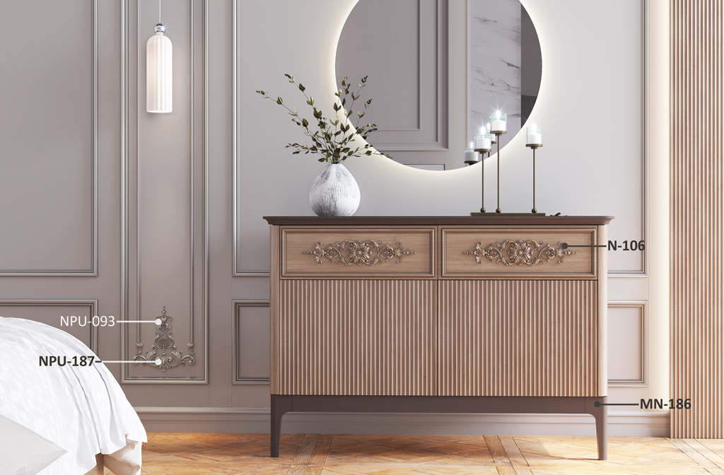 Для оформления нижней части фасада комода используются резные накладки NPU-093 и NPU-187. Эти накладки, выполненные из полиуретана, представляют собой утончённые декоративные элементы, которые добавляют изделию особую изысканность. Они украшают нижние панели комода, создавая акцент и добавляя изделию визуальную привлекательность.