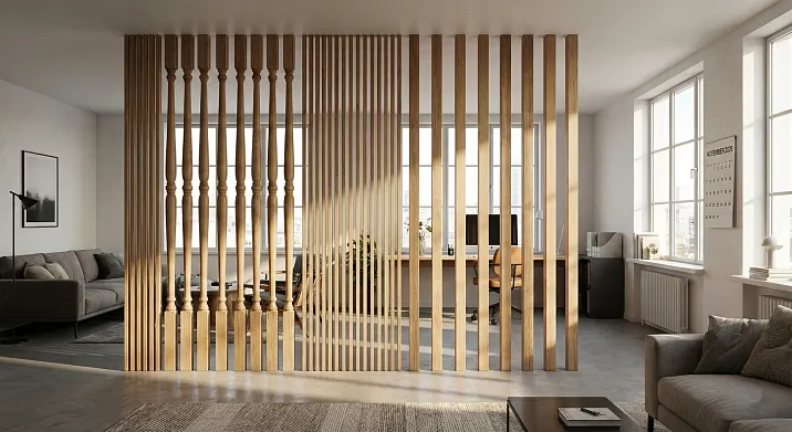 A slatted partition is a conceptual breakthrough in organizing living space. A traditional wall creates two isolated rooms. Glazing — visually unites, but physically separates. A slatted construction is in between: it marks a boundary, but leaves permeability — visual, light, acoustic (to a lesser extent), emotional.