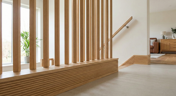 Balusters can be not only on staircases. Vertical wooden rails serving as decorative or functional partitions work on the same principle. They create a vertical rhythm, zone space, without creating solid walls, allowing light and air to pass through. Such rails are especially popular in 2026 in biophilic design — they mimic tree trunks in the forest, creating a connection with nature.