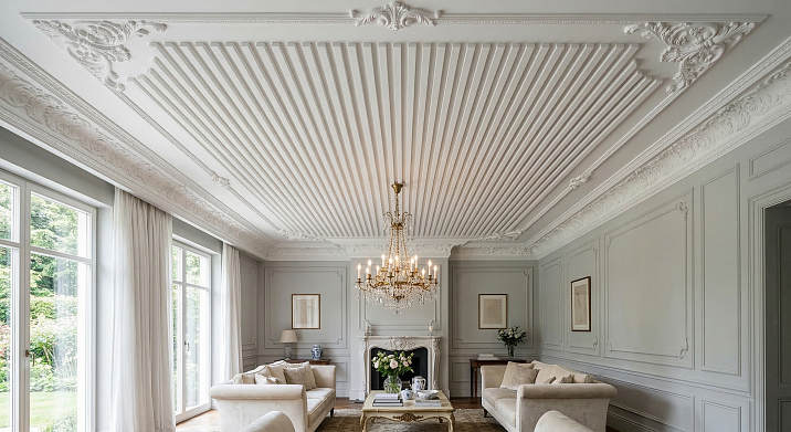 If the slats are narrow and frequent, the molding should be delicate. A thin cornice plus a small rosette—nothing more. If the molding is developed and ornamental, make the slatted rhythm sparser and wider. If the room is small—one cornice along the perimeter. Any additional element in a small space creates overload. If the room is large—a cornice plus one accent element: a rosette or zonal coffers above the main area. Not both at once.